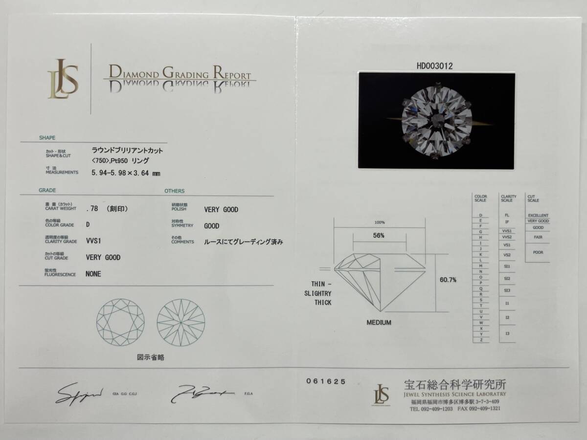 | カラット数:0.786ct リングサイズ:約 12号 高さ:約 0.6cm 総重量:約 2.7g サイズ表記(~cm位)は目安です。ブランドやデザインによって多少前後する場合がございます。予めご了承の上ご注文ください。 ![]() | ||||||