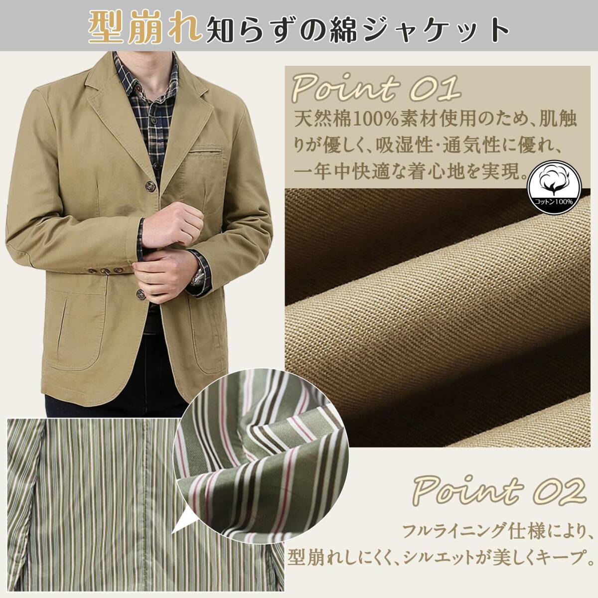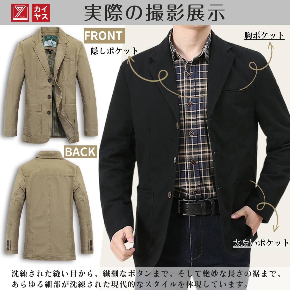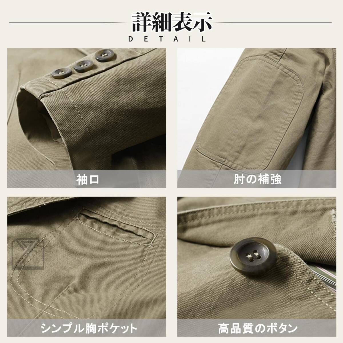 【色とサイズ】無地のメンズ ブレザージャケットで、シンプルながらスタイリッシュ。ブブラック、アーミーグリーン、カーキの3色から選択でき、Mサイズから4XLサイズまで豊富なサイズ展開。メンズジャケットとして幅広いスタイルに合わせられます。