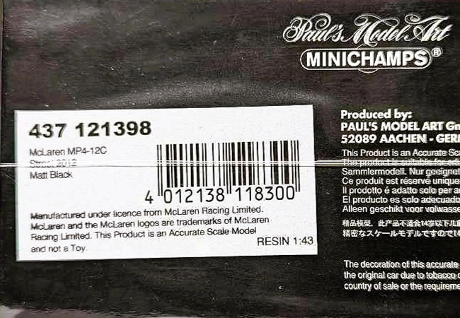 【 Minichamps 】1:43 McLaren MP4-12C 2012 #437 121398