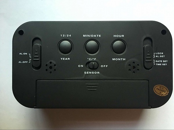・時計後ろの三つの丸ボタンのいずれかを押してもアラームが止めることができます。翌日の同じ時刻でまた鳴り出します。