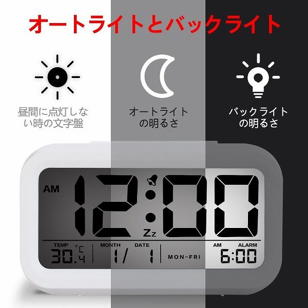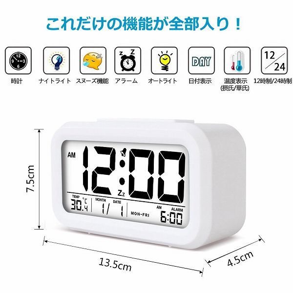 デジタル 目覚まし時計 (ホワイト) シンプル 見やすい バックライト スヌーズ 大音量 温度計