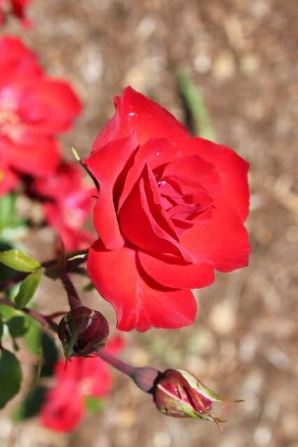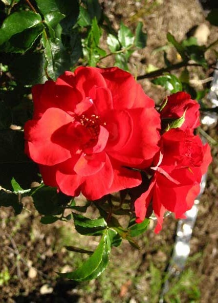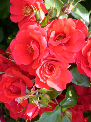 花色:輝く朱赤 香り:★☆☆ 四季咲き 花径:8cm 半八重平咲