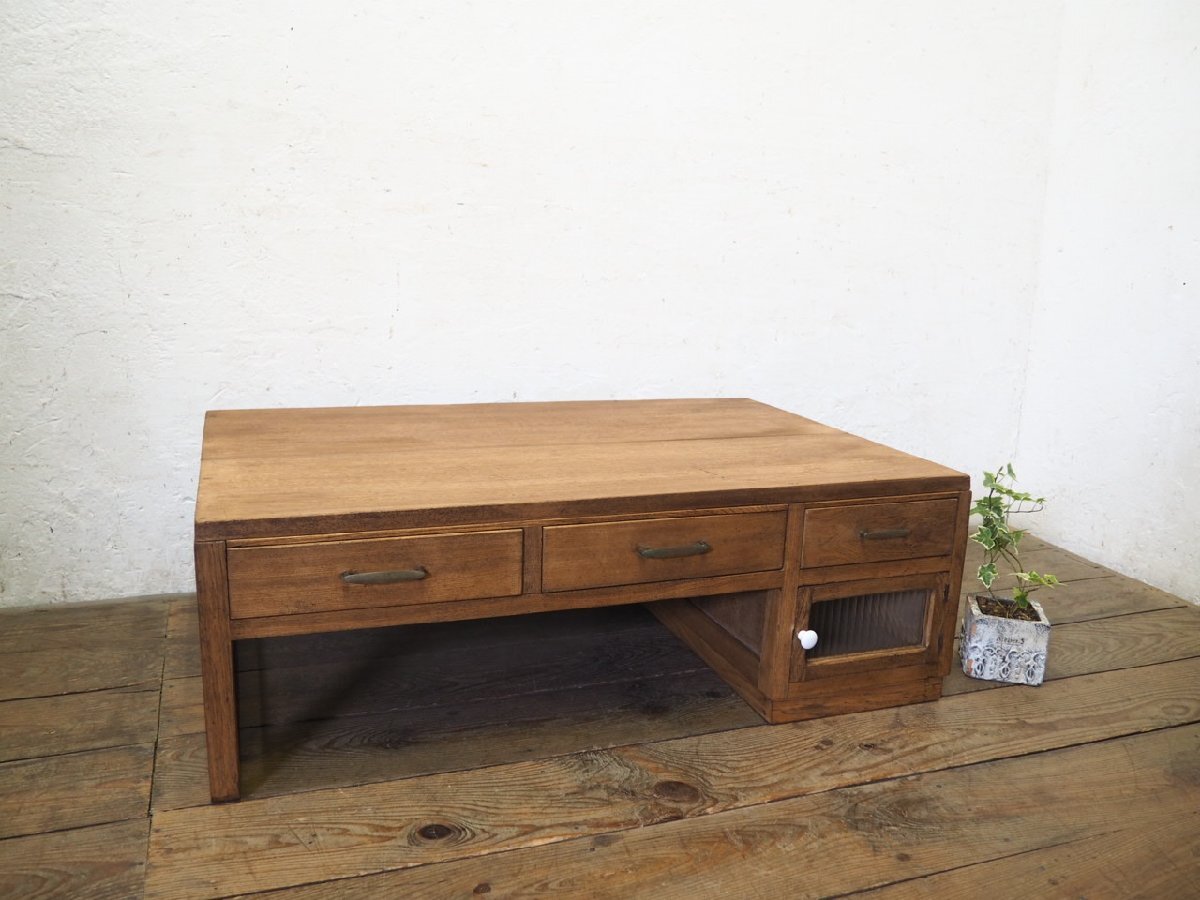 タ荷S0333◆天板W100cm×66cm◆可愛いモールガラスいり◆ロータイプの古い木製片袖机◆ローテーブル 座卓 レトロ ヴィンテージM(ヤC)庭