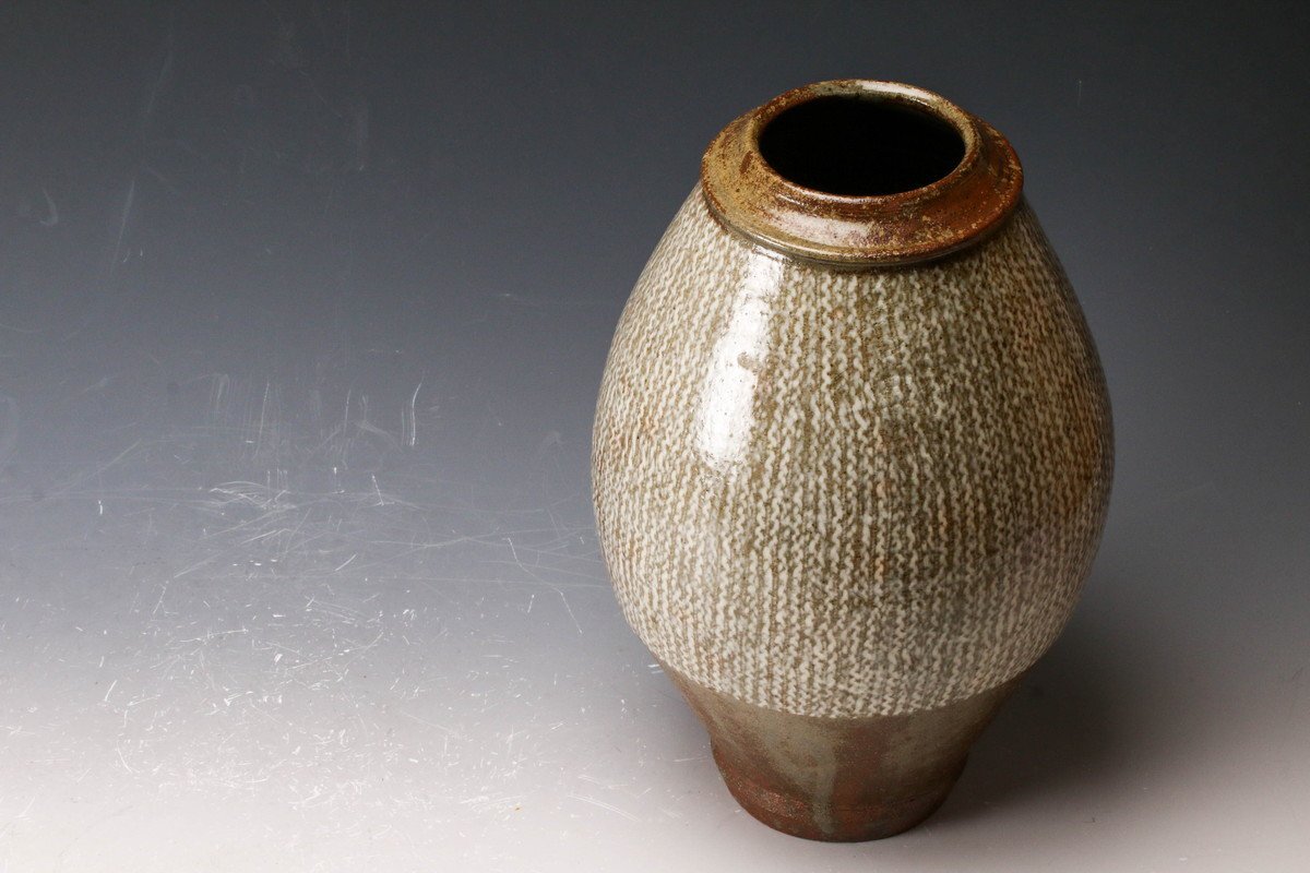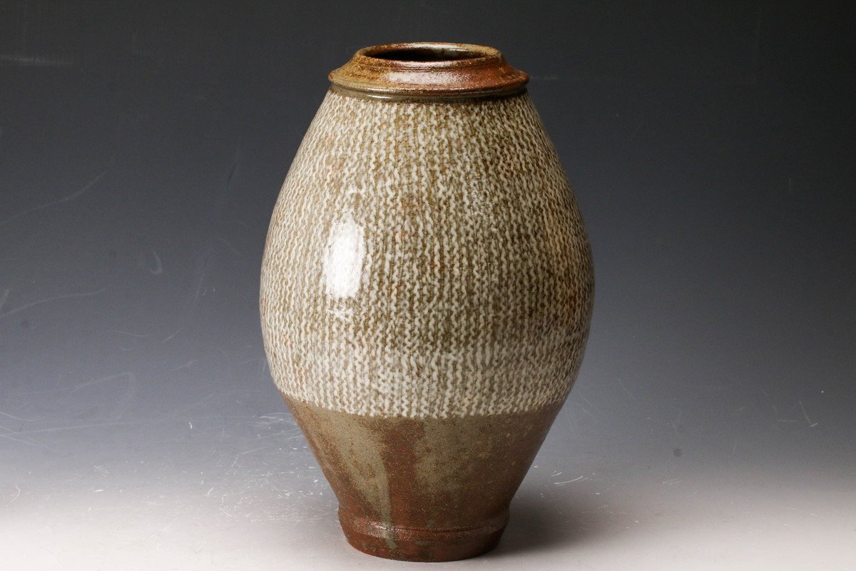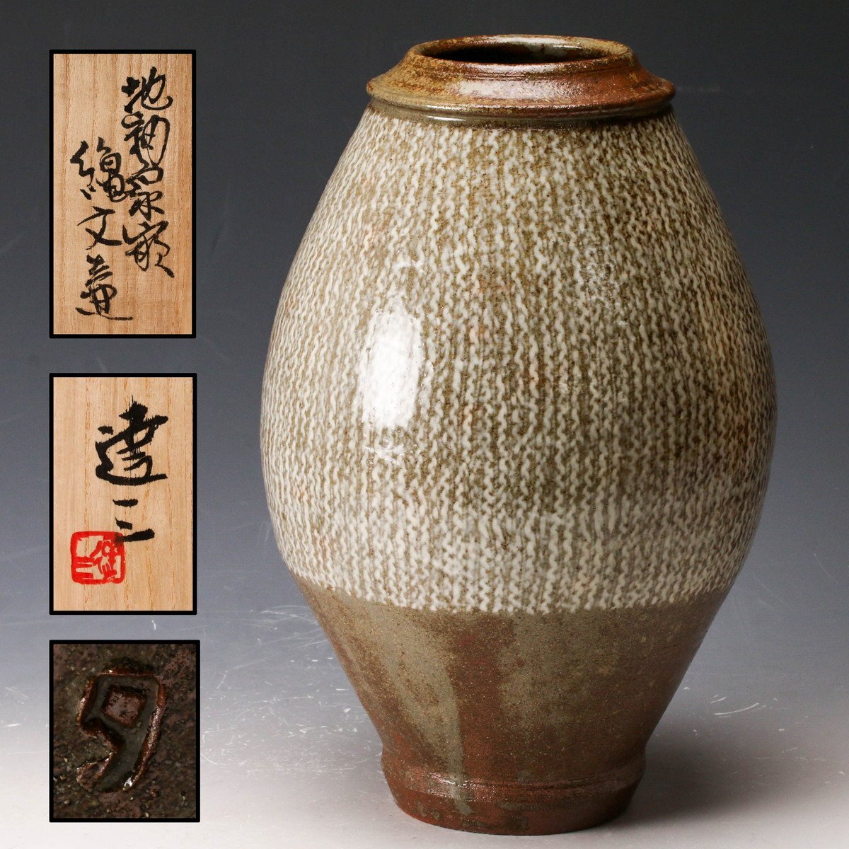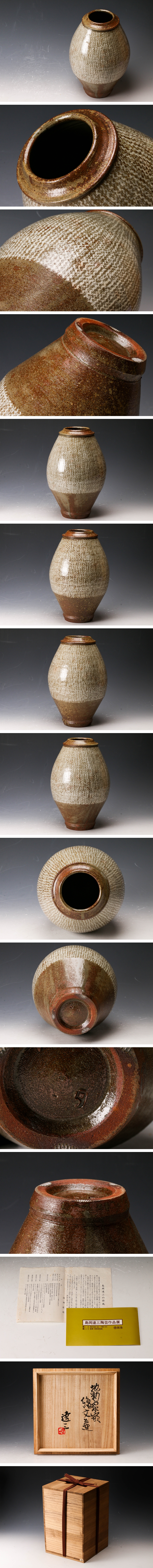 【佳香】島岡達三 高さ30cm 地釉象嵌線文壷 共箱 栞 作品展案内 本物保証