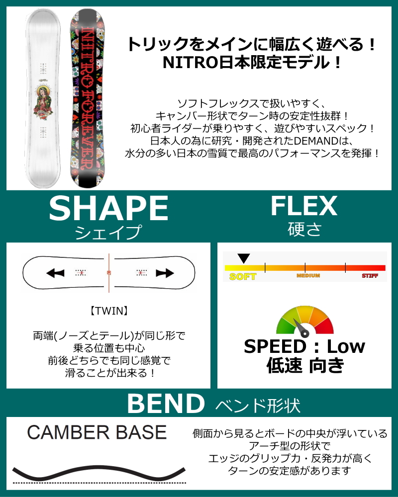 日本人向けに設計されており、低・中速で扱いやすいソフトフレックスボード!柔らかく操作性がいいので、ターンの練習に最適!ソフトフレックスのハイブリッドキャンバーは、操作がしやすく扱いやすいので、ターンの練習やラントリ、地形遊びで最高のパフォーマンスを発揮!