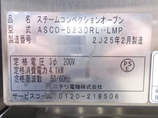 ニチワ 2025年 スチームコンベクションオーブン ASCO-5230RL-LMP 業務用 中古厨房/25K2028Z