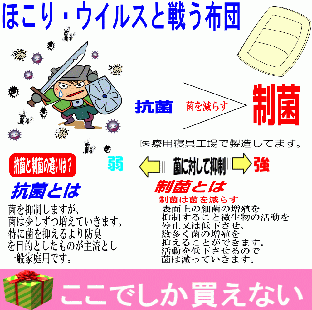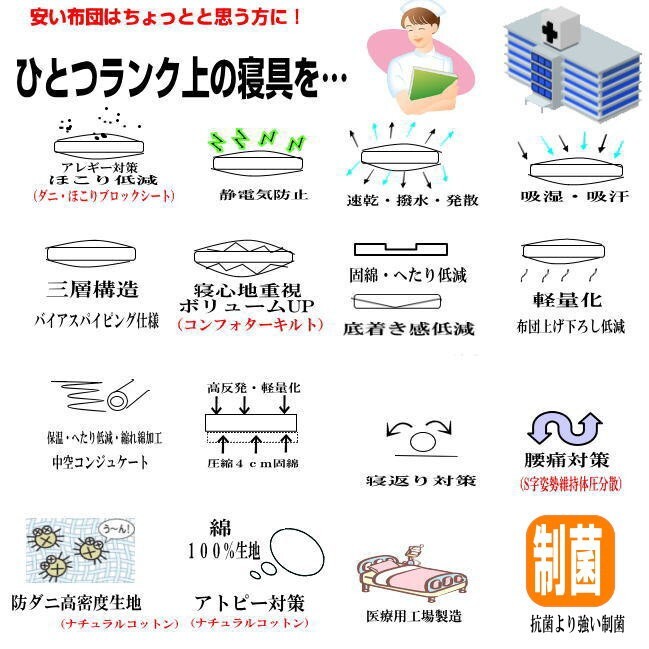 この布団は抗菌より強い制菌防臭加工で医療用布団工場で製造した日本製の軽量3層の 病院、ホテル、施設、託児所