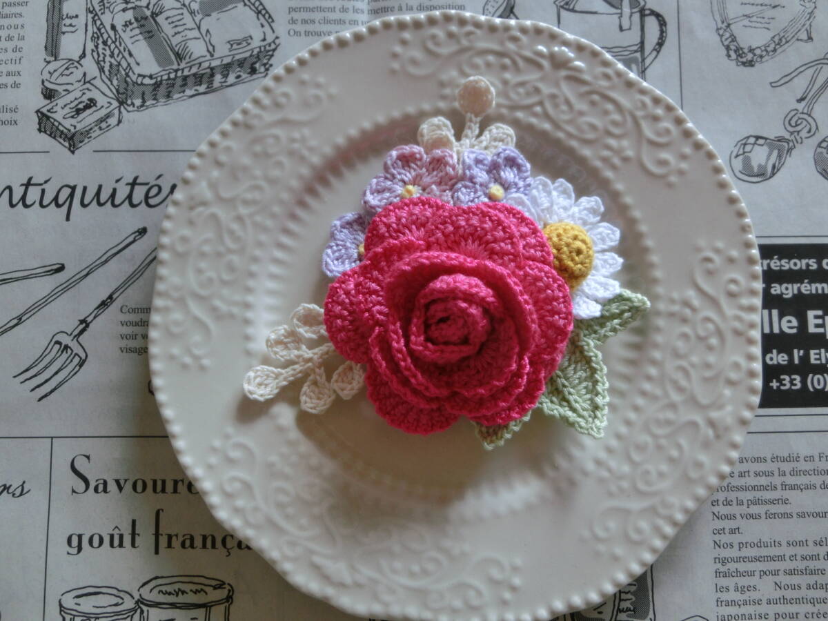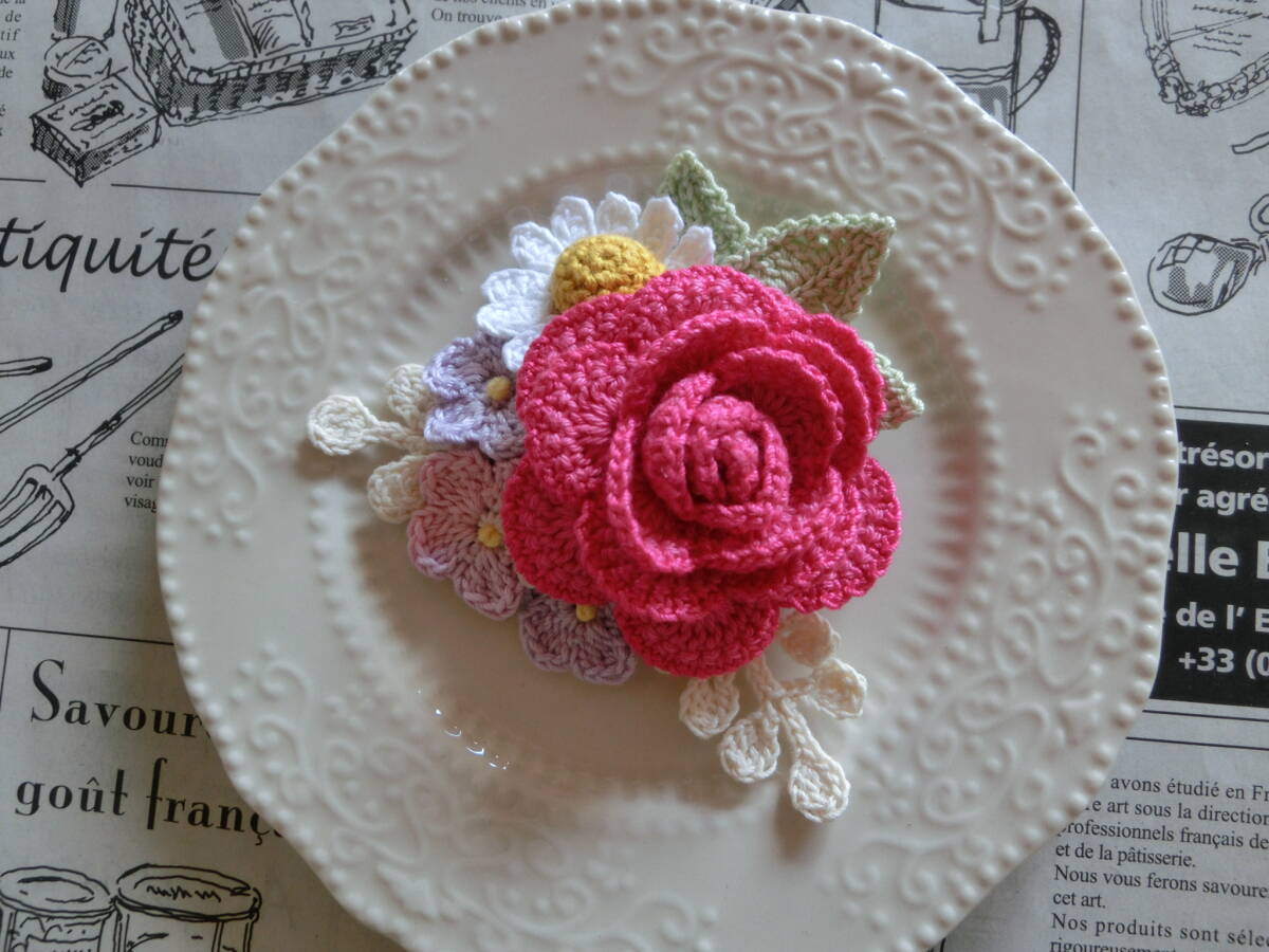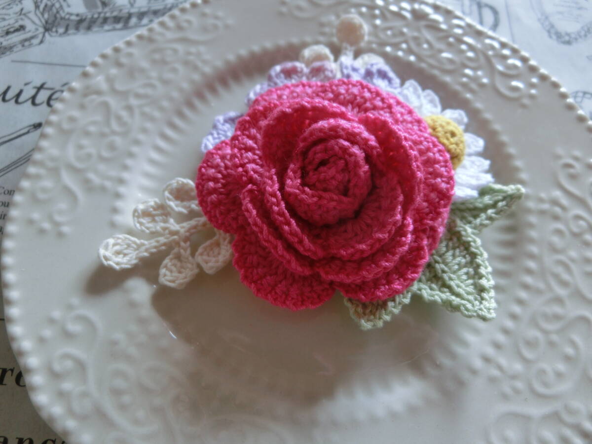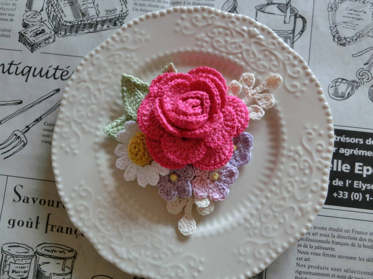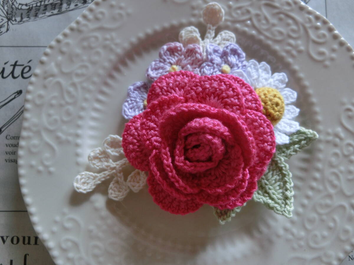 ☆ 2491  薔薇と小花のブーケ  濃いピンク色系薔薇  クロシェレース  コサージュ  ハンドメイド