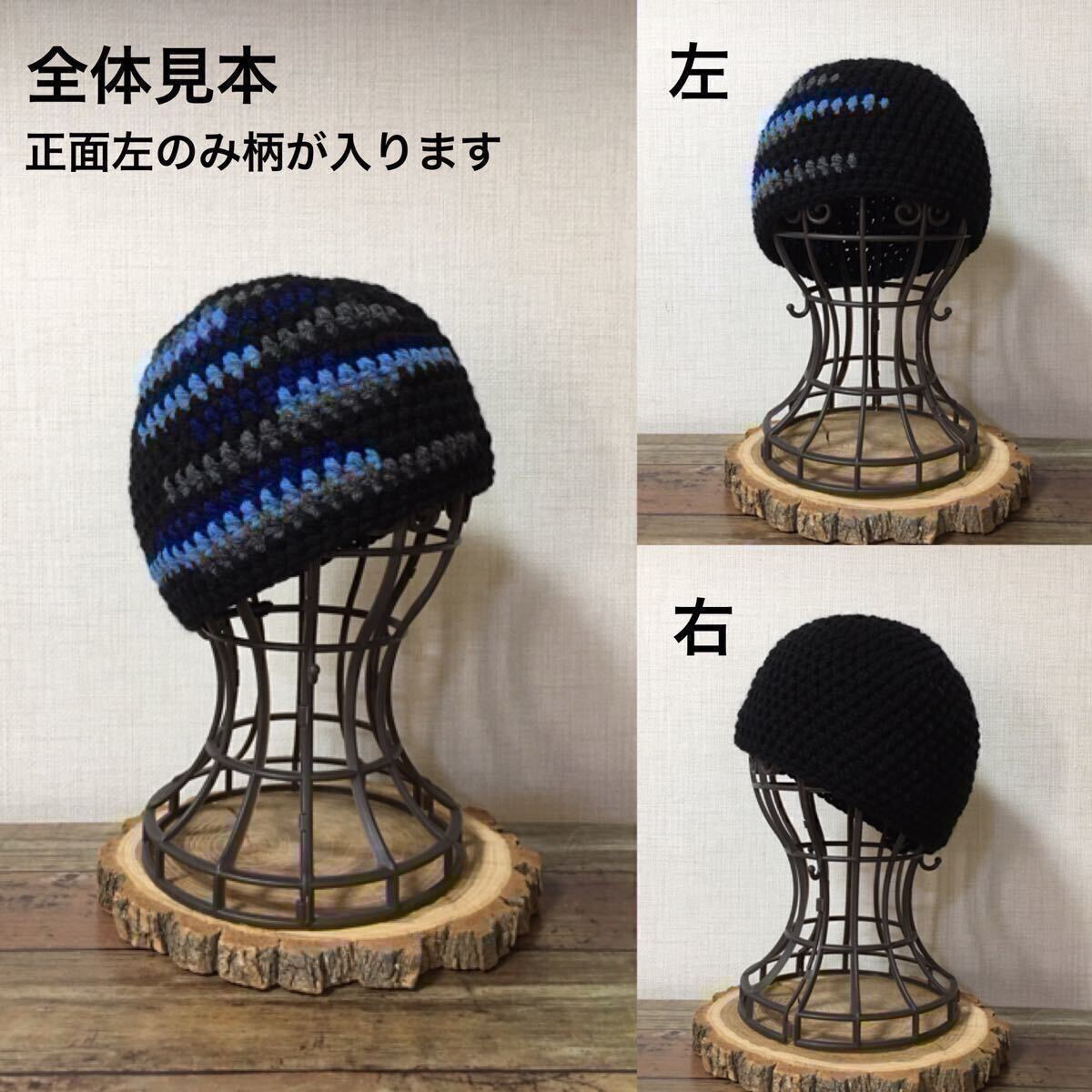 こちらは見本試作品のランダム柄のハンドメイドニット帽となります。サイズと4つのカラーを指定できるオーダーニット帽となります。記載よりお好きなカラーとサイズを選択して頂きフルオーダーで作らせていただきます。