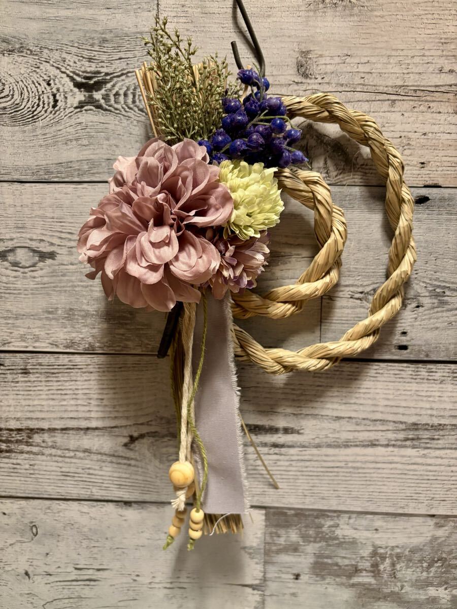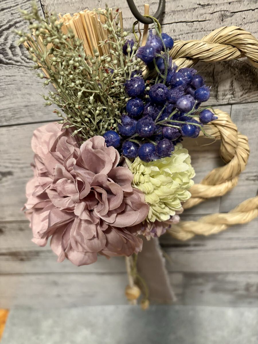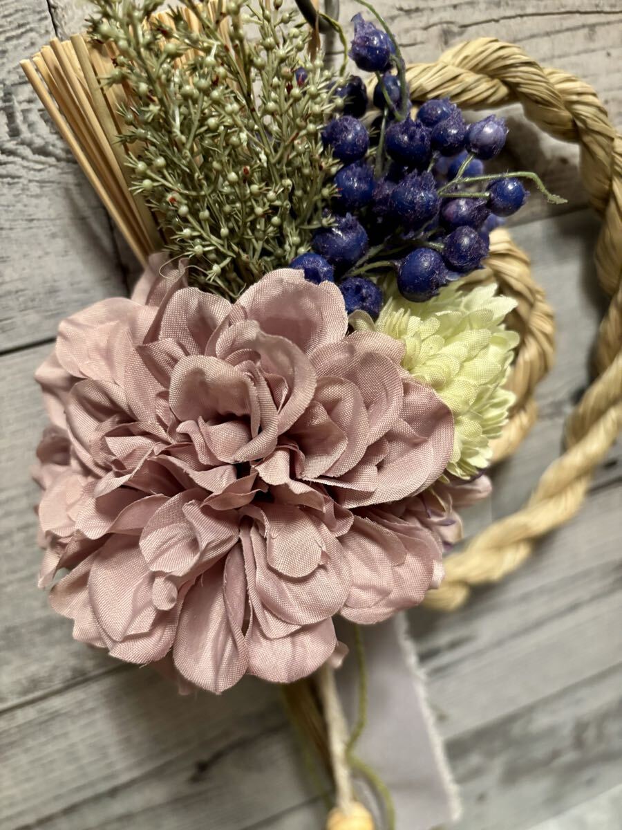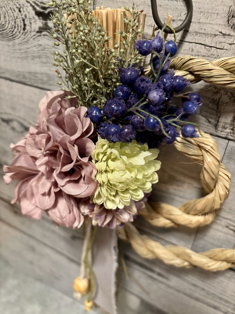 しめ縄は天然素材、お花等は造花にてお作りしています