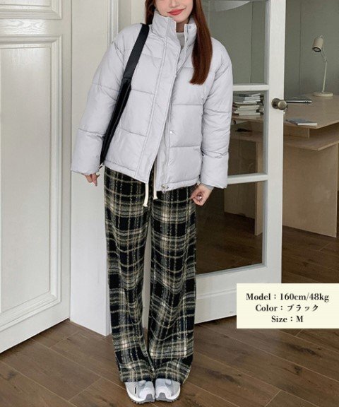 チェック柄と起毛感が魅力の、秋冬にぴったりな素材です。ウエストはゴム仕様で、快適なフィット感を実現します。