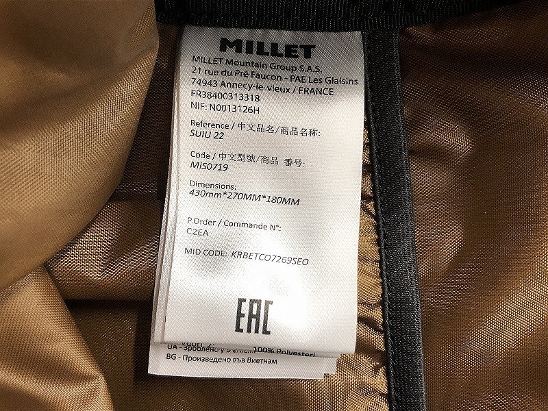 ミレー MILLET SUIU22 スイウ22 バックパック リュックサック ブラック ベージュ MIS0719