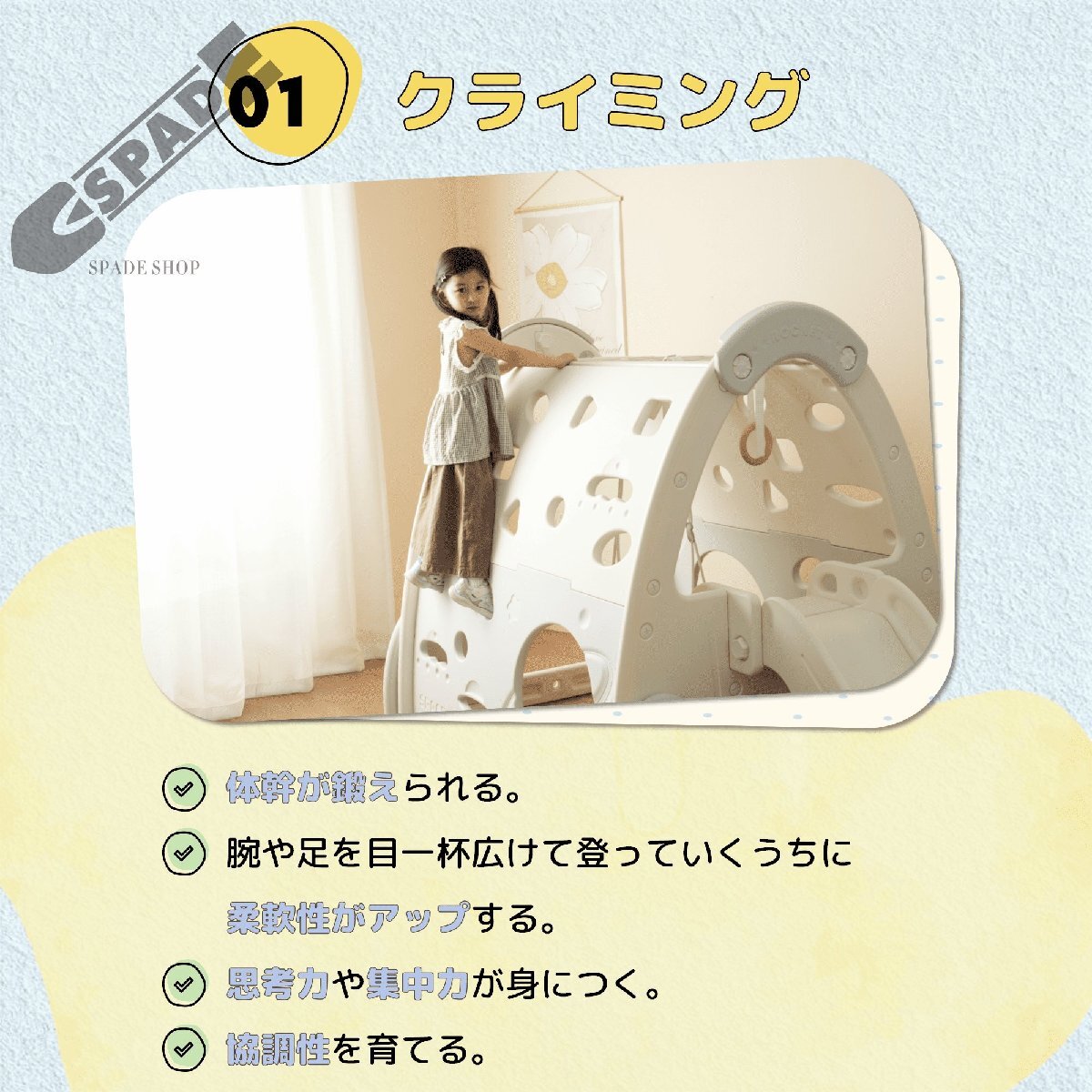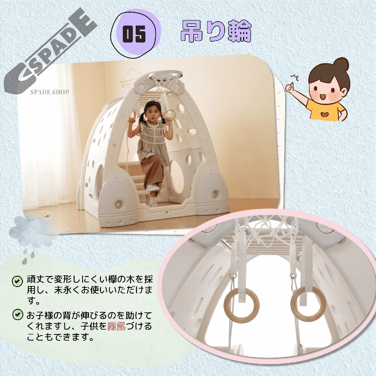 • 【吊り輪】頑丈で変形しにくい欅のきを採用し、末永くお使いいただけます。お子様の背が伸びるのを助けてくれますし、子供を勇気プけることもできます。