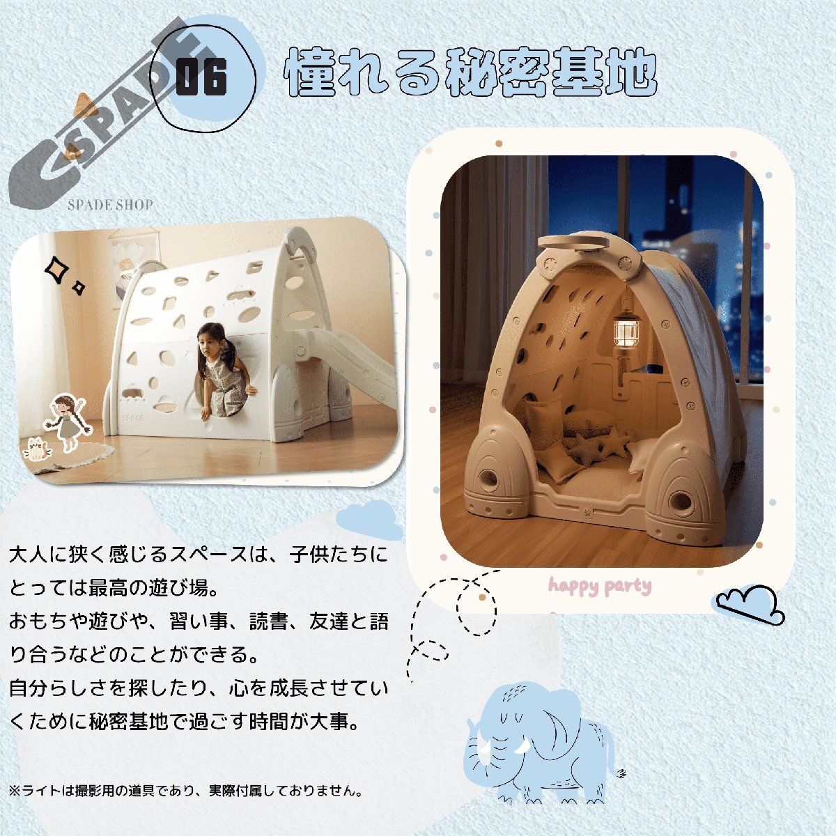 • 【 憧れる秘密基地】 大人に狭く感じるスペースは、子供たちにとっては最高の遊び場。おもちや遊びや、習い事、読書、友達と語り合うなどのことができる。自分らしさを探したり、心を成長させていくために秘密基地で過ごす時間が大事。※ライトは撮影用の道具であり、実際付属しておりません。