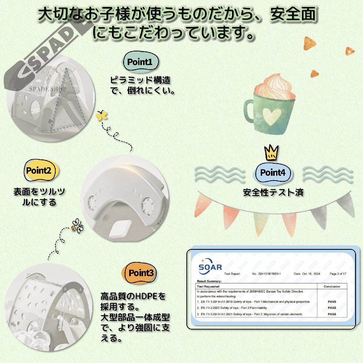 • 【大切なお子様が使うものだから、安全面にもこだわっています。】Point1ピラミッド構造で、倒れにくい。Point2表面をツルツルにするPoint3高品質のHDPEを採用する。大型部品一体成型で、より強固に支える。Point4 安全性テス卜済