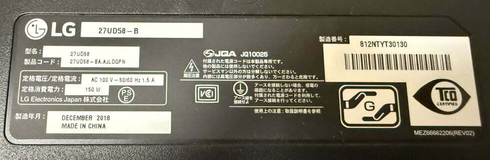 LG 27UD58-B (4K2K 27型AH-IPS液晶) モニタースタンドなし