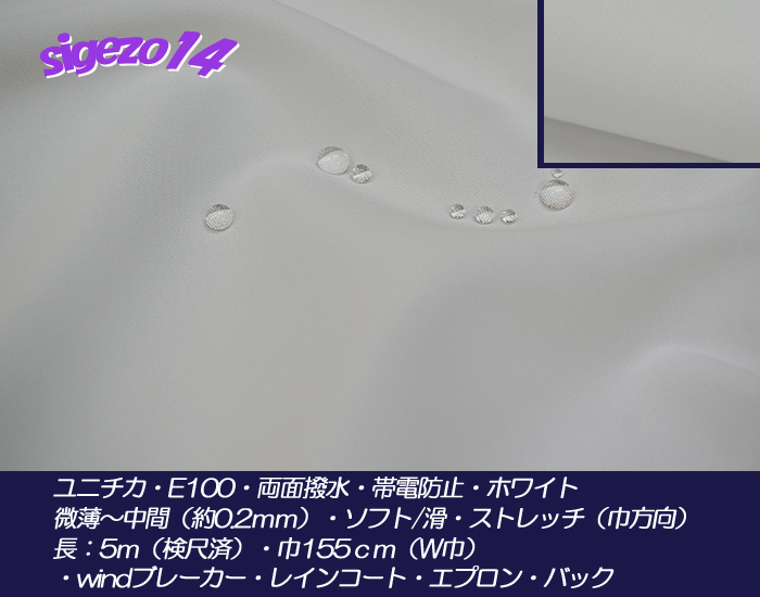1G SY 長5m W巾 両面撥水 帯電防止 ホワイト ユニチカE100ストレッチ中間ソフト滑 / windブレーカー レインコート エプロン・バック・手芸