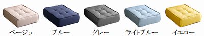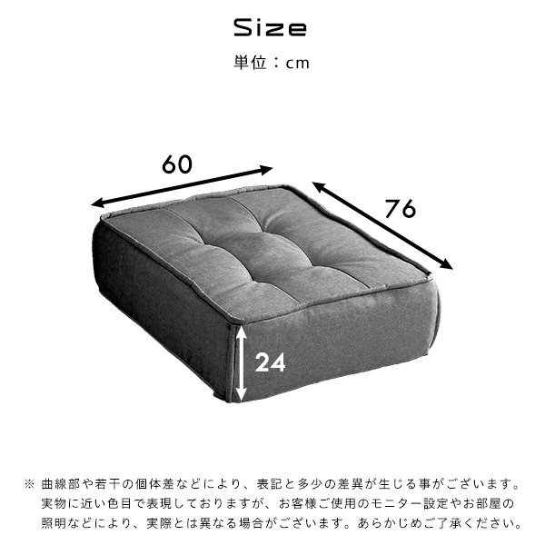 | 【カラー】 ベージュ、ブルー、グレー、ライトブルー、イエロー 【サイズ】 W60xD76xH24cm 【重量】 5.7kg 【素材】 側生地:ポリエステル100% 中身:ウレタンフォーム、ポケットコイルスプリング 【梱包】 サイズ:75x60x25cm、重量:6.5kg 【完成品】 届いて直ぐ使えます。 【ご注意】 ・サイズ、重量は概算です。 ・商品カラーはご使用のモニターによって実際の明るさや色と異なって見える場合がございます。 |