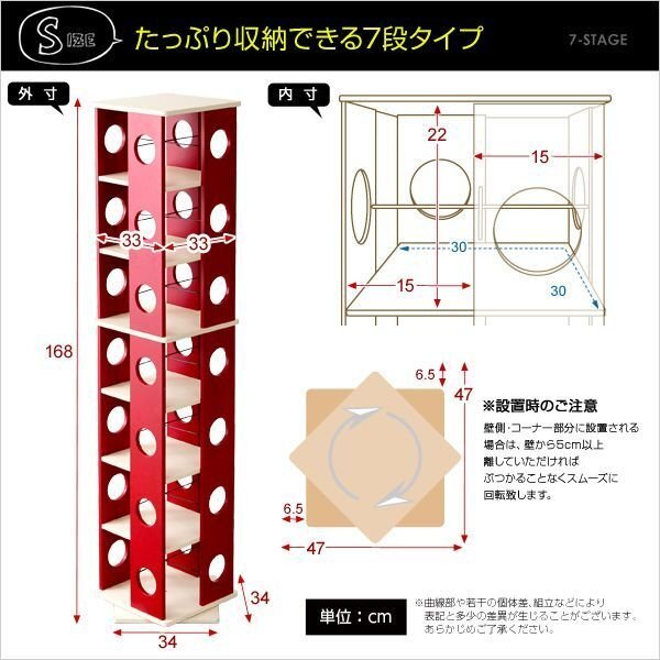 【カラー】 ダークブラウン、ホワイト、レッド、ブラック 【サイズ】 外寸:(約)幅34×奥行34×高さ168cm 内寸:(約)幅15×奥行15×高さ22cm(1フロア/4面共通) 【重量】 (約)20kg 【材質】 構造部材:MDF/表面加工:ウレタン樹脂加工 【梱包】 サイズ:(約)96.5×39×19cm(2.6才) 重量:(約)21kg 【その他】 耐加重:棚板1枚につき(約)10kg 【組み立て品】 お客様による組み立てが必要です。 |