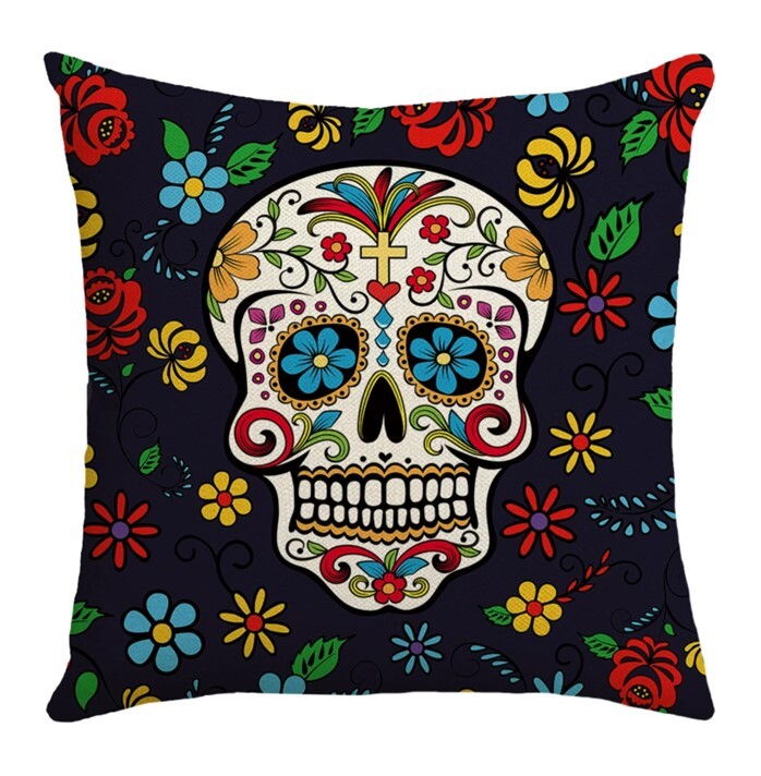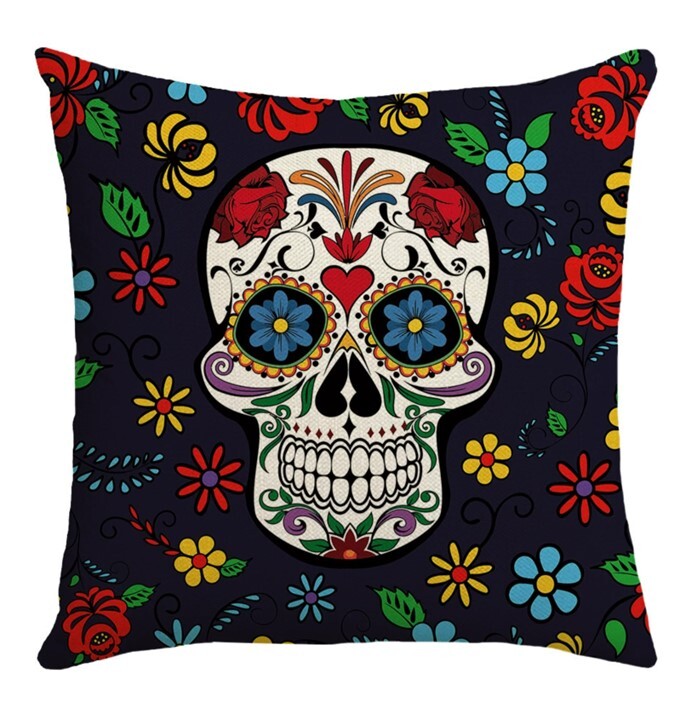 お部屋にパンチと遊び心をプラス!メキシコの「死者の日」で使われるカラフルなシュガースカル(カラベラ)がモチーフのクッションカバーです。