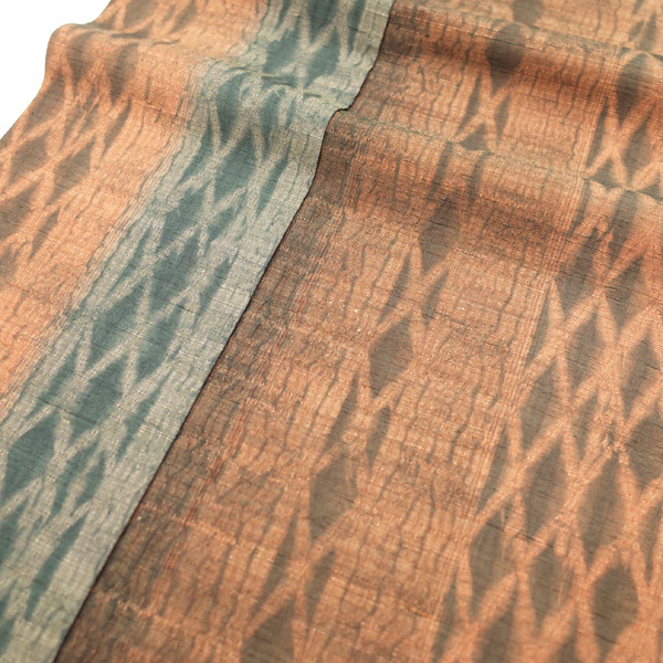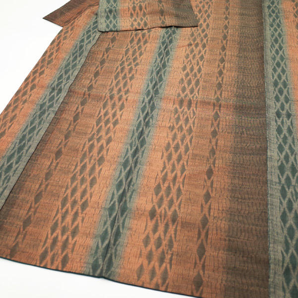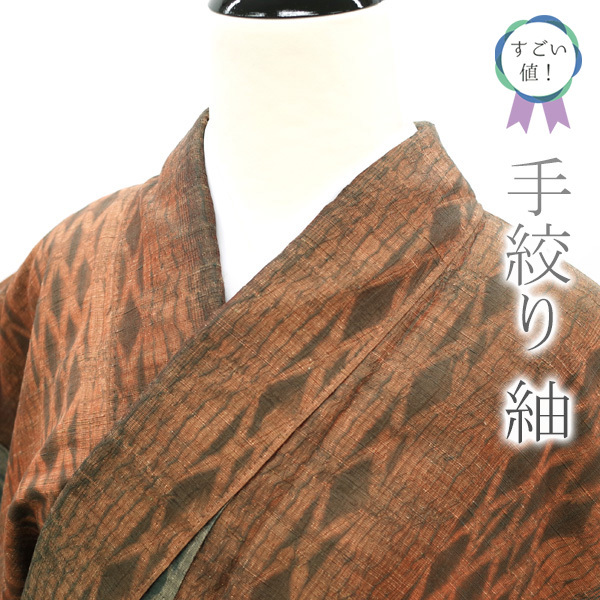 【中古】 すごい値! 紬 リサイクル 着物 袷 正絹 本加工 手織り 手絞り 絞り 赤茶色 ブラウン 緑 菱 モダン柄 カジュアル 中古 仕立て上がり 身丈161 裄丈66 Mサイズ リサイクル着物 味わいある 紬地 普段着 観劇 お食事 ショッピング お出かけ など 販売 購入 綺麗 美品 リユース すごいね みやがわ nek00104