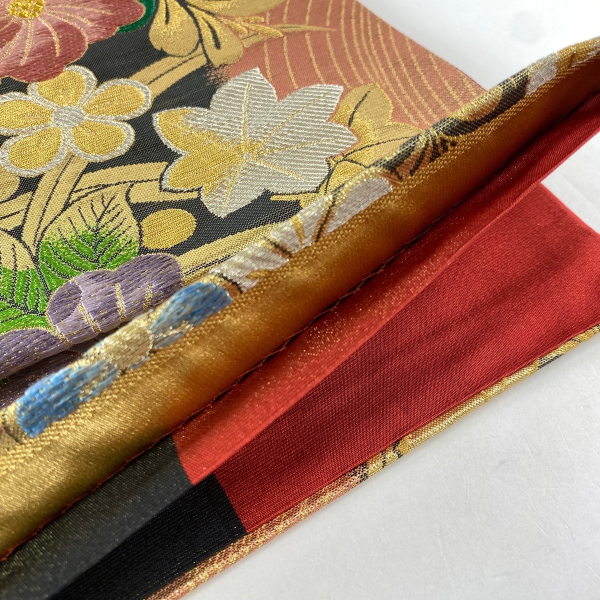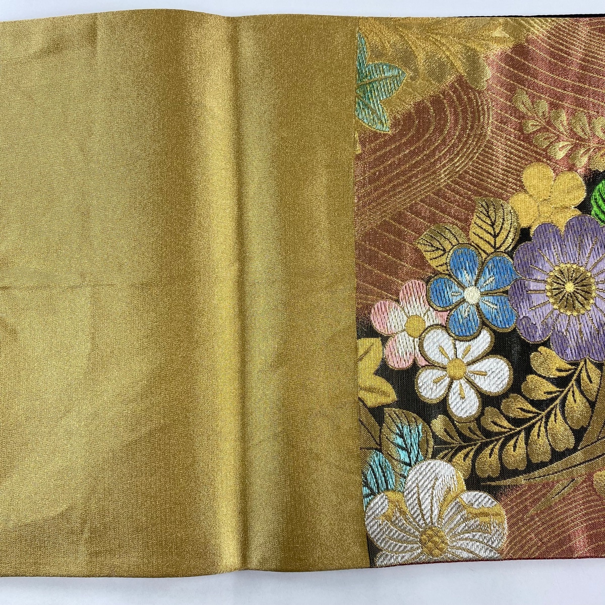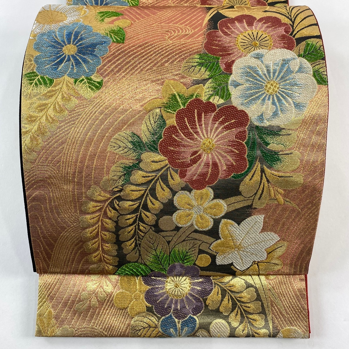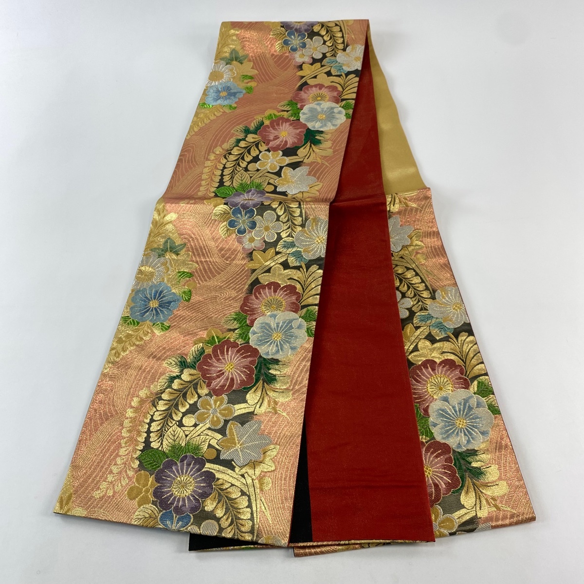 | 袋帯 美品 秀品 草花 波 箔 金銀糸 朱色 六通 正絹 【中古】 |
