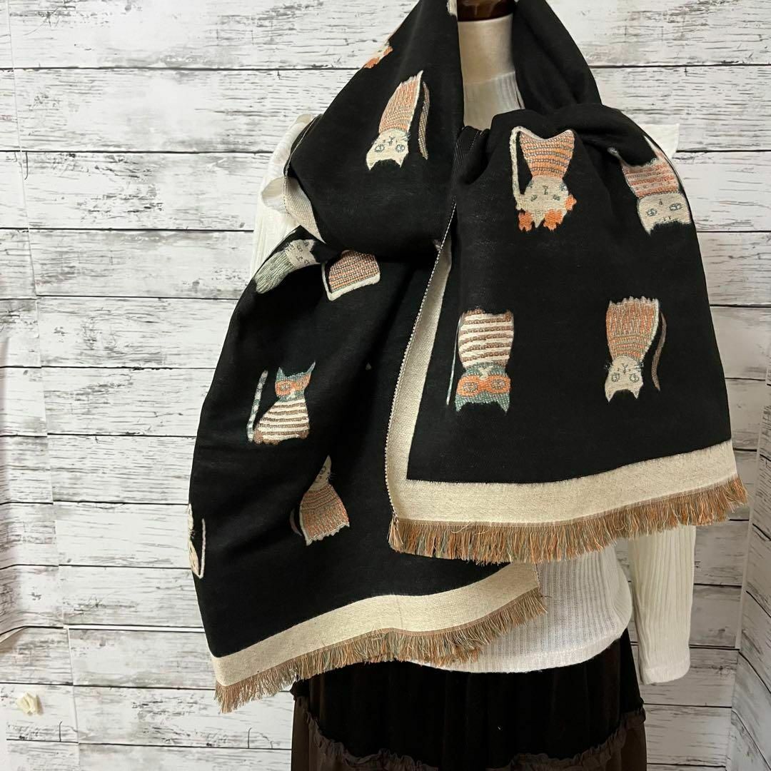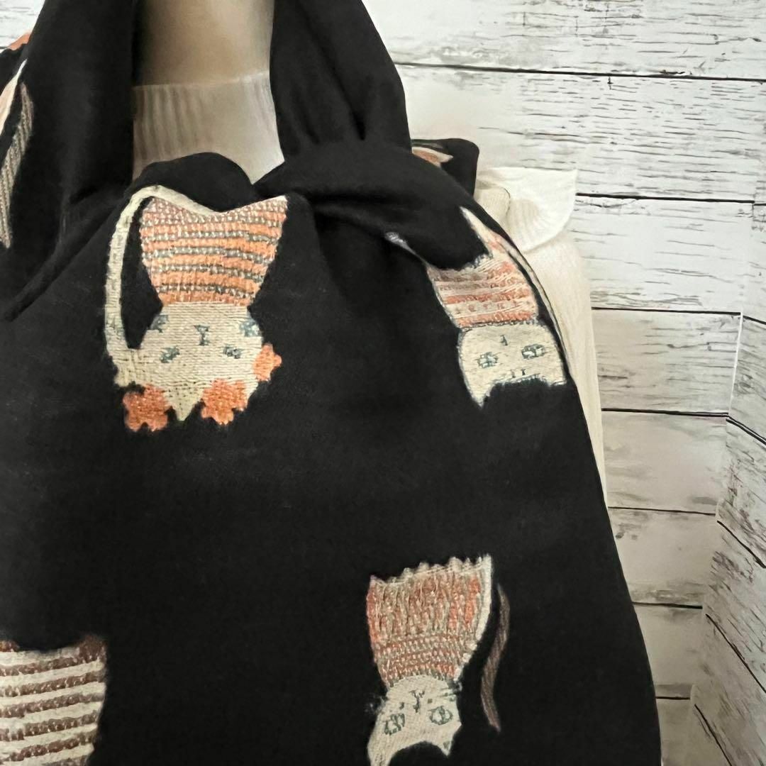 黒地に眼鏡をかけた猫の刺繍が施されたストール