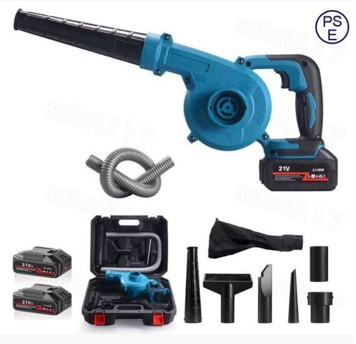 パッケージ内容:充電式ブロワー本体*1、ノズルA*1、ノズルB*1、ノズルC*1、延長チューブ*1、ダストバッグ*1、リチウムバッテリー*2、急速充電器*1