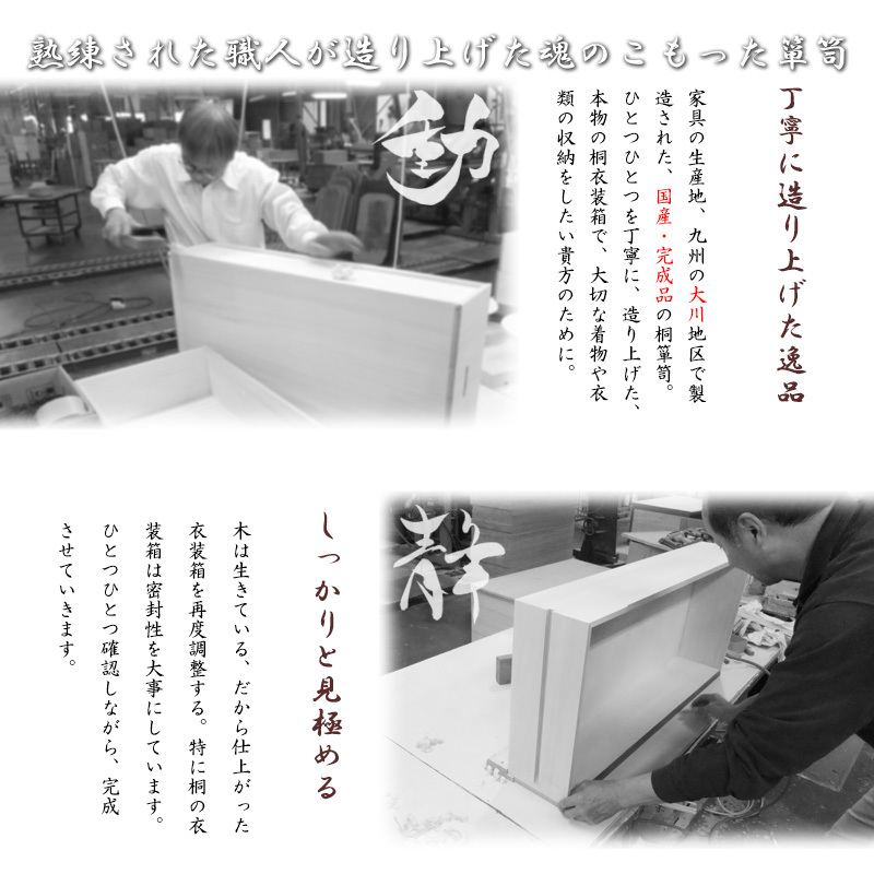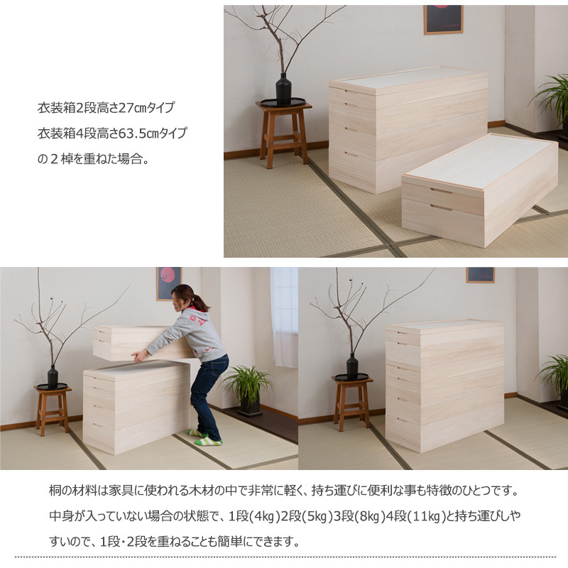 ■商品について/取っ手金物のないシンプルに仕上げたモダンな印象の桐衣装箱。洋室などのフローリングにも合うデザインで和室だけでなく幅広いシーンにはまります。桐材は内部を一定の湿度に保とうとする働きがあるので大事な着物や洋服などを湿気から守る桐箱にしまうのがベスト。内部には竹炭シートを施しているので、消臭効果もプラス!クローゼット上などコンパクトな1段タイプからラインナップし、着物や浴衣、洋服など長期保管に最適です。蓋は印籠式を採用により密閉性を高めた仕様で15mm厚の頑丈なつくりはもちろん、その構造だからできる繊細で優雅なデザイン。買い足し積み重ねができるので増える着物と洋服をしっかり収納。