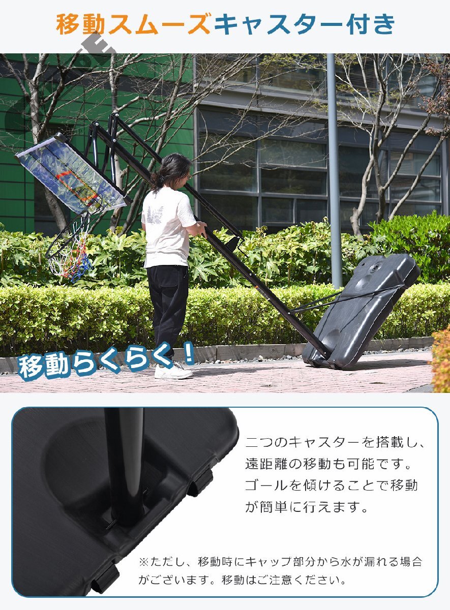 • 【移動スムーズキャスター付き】二つのキャスターを搭載し、遠距離の移動も可能です。ゴールを傾けることで移動が簡単に行えます。 ※ただし、移動時にキャップ部分から水が漏れる場合がございます。移動はご注意ください。