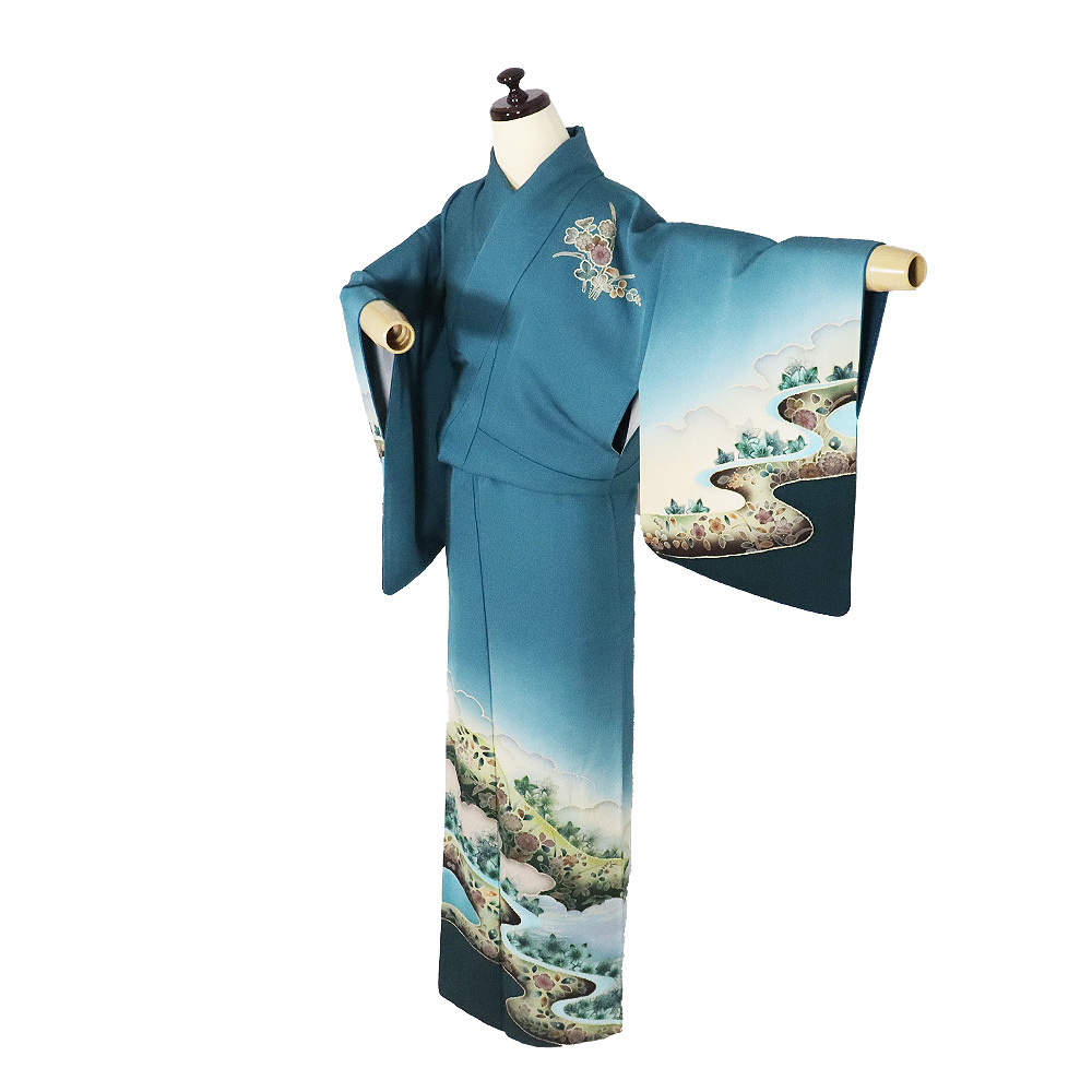 | 商品 | 辻が花訪問着 袷 丹後縮緬地 緑(藍色)・ベージュ(蒸栗色)・水色(勿忘草色)・ 濃い緑(黒緑色)・暈し地 絞り・辻が花・桜・菊・桐 159 広襟 |