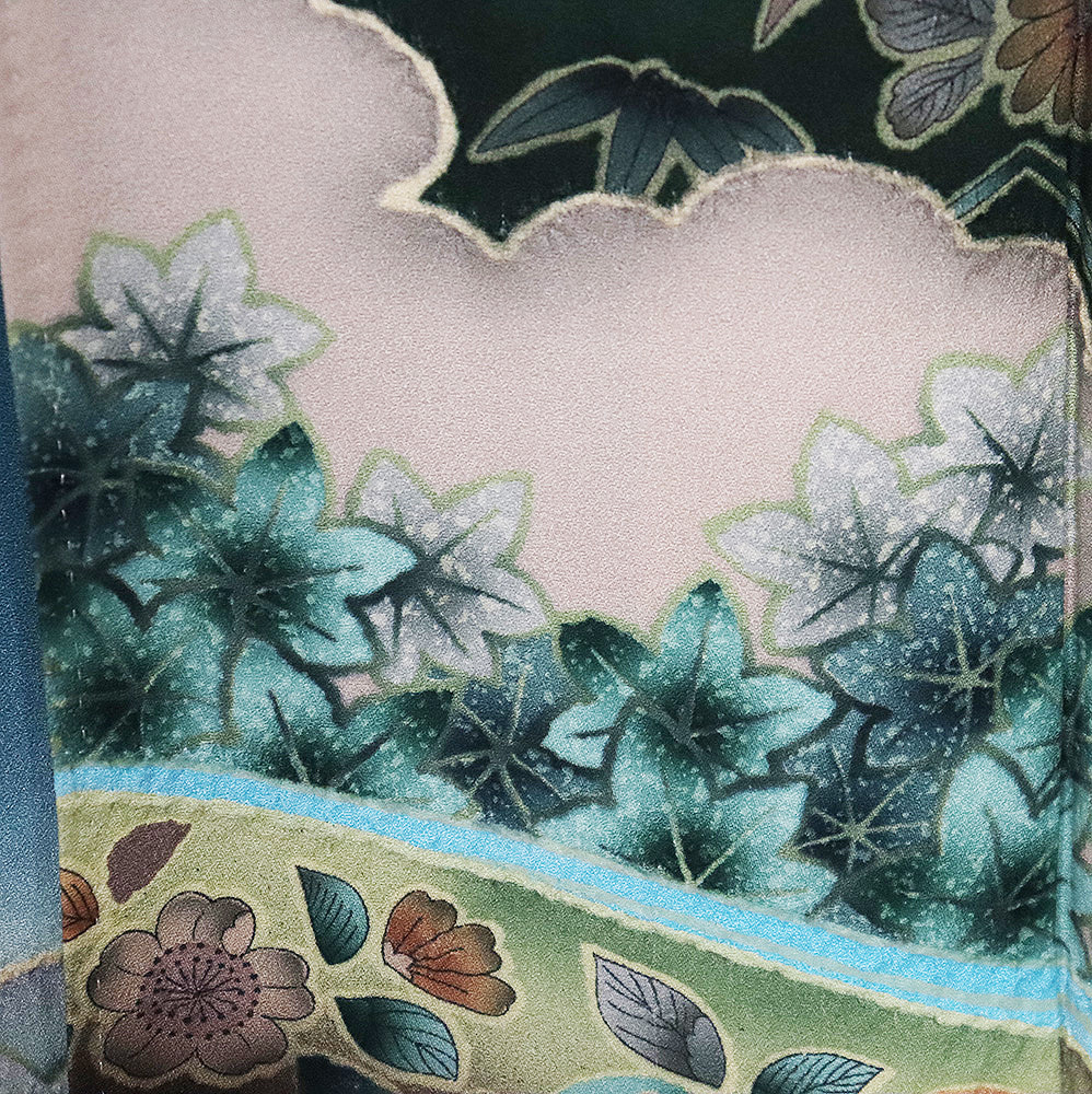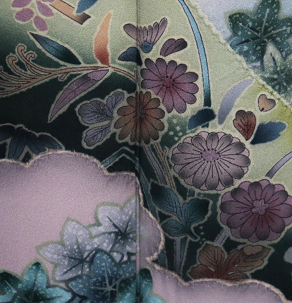 | 色・柄 | 辻が花訪問着 袷 丹後縮緬地 緑(藍色)・ベージュ(蒸栗色)・水色(勿忘草色)・ 濃い緑(黒緑色)・暈し地 絞り・辻が花・桜・菊・桐 (写真では上手く色が出ない場合があります。ご了承下さい) |