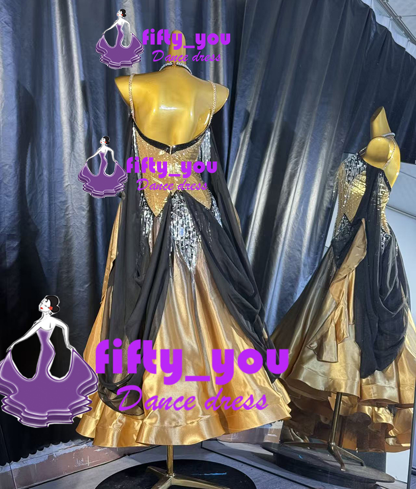 新品fifty_youオリジナルレディース社交ダンスドレス  モダン競技ドレス セミオーダー スタンダードドレス  黒金グラテーション色