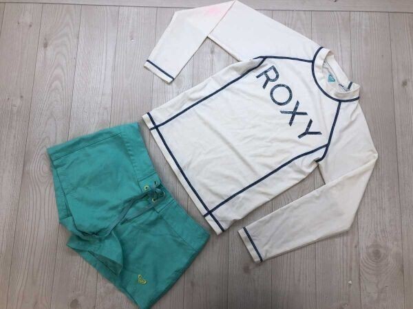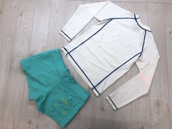 ロキシー ROXY アメカジ サーフ ビーチ スポーツ ラッシュガード ショートパンツ 上下 セットアップ キッズ 140/S 白 青 ミントグリーン です。