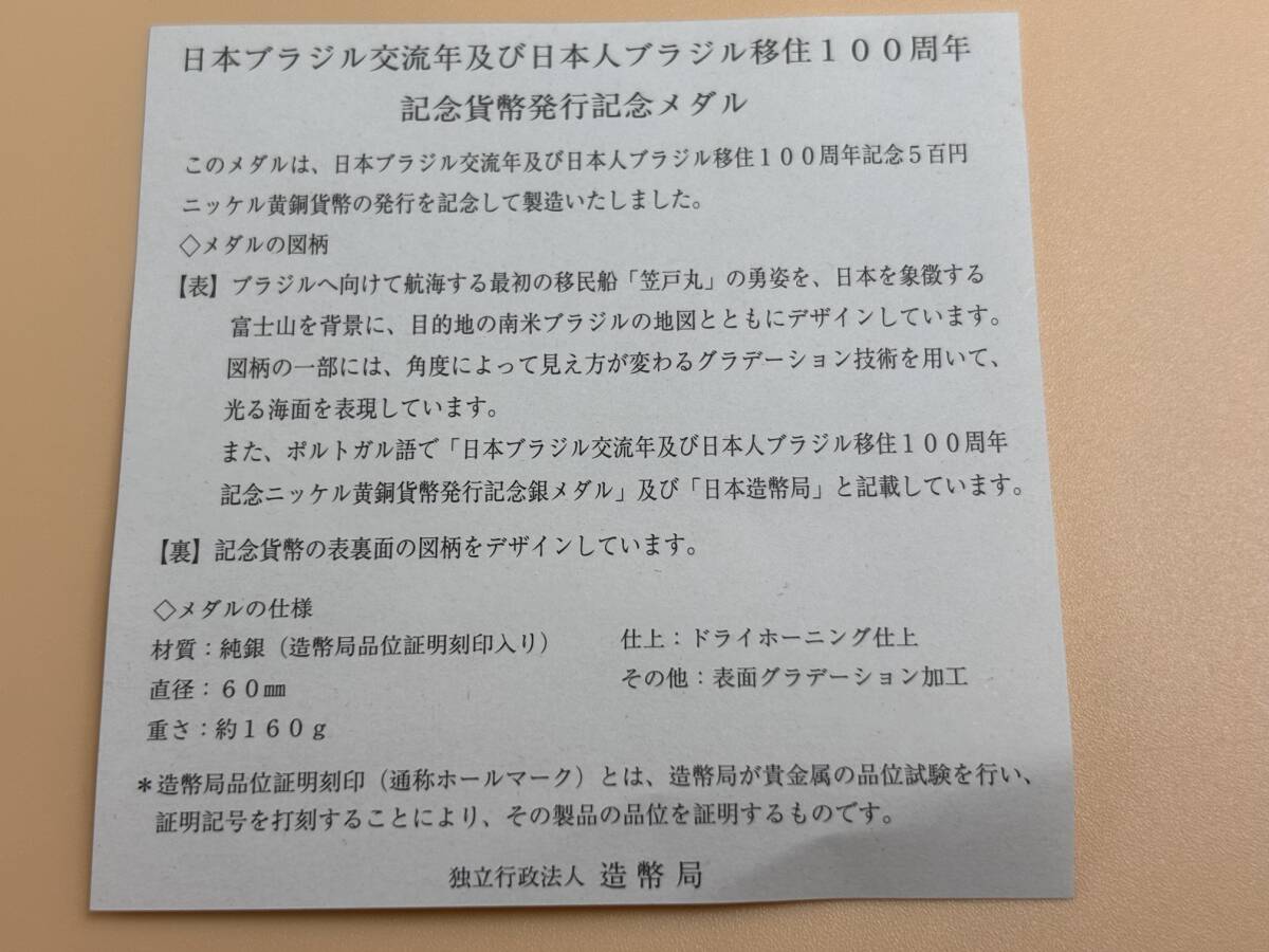◇平成20年純銀160g 日本人ブラジル移住百周年記念貨幣発行記念銀メダル ◇