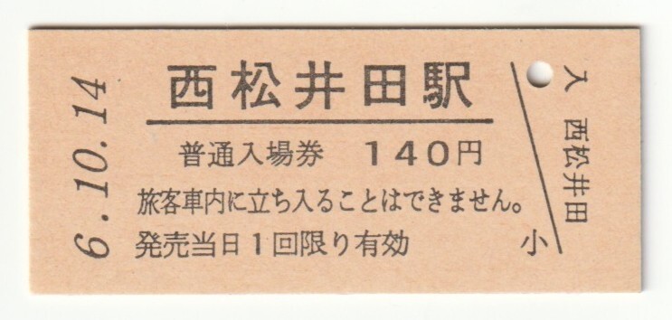 平成6年10月14日 信越本線 西松井田駅 140円硬券普通入場券(日付印刷)