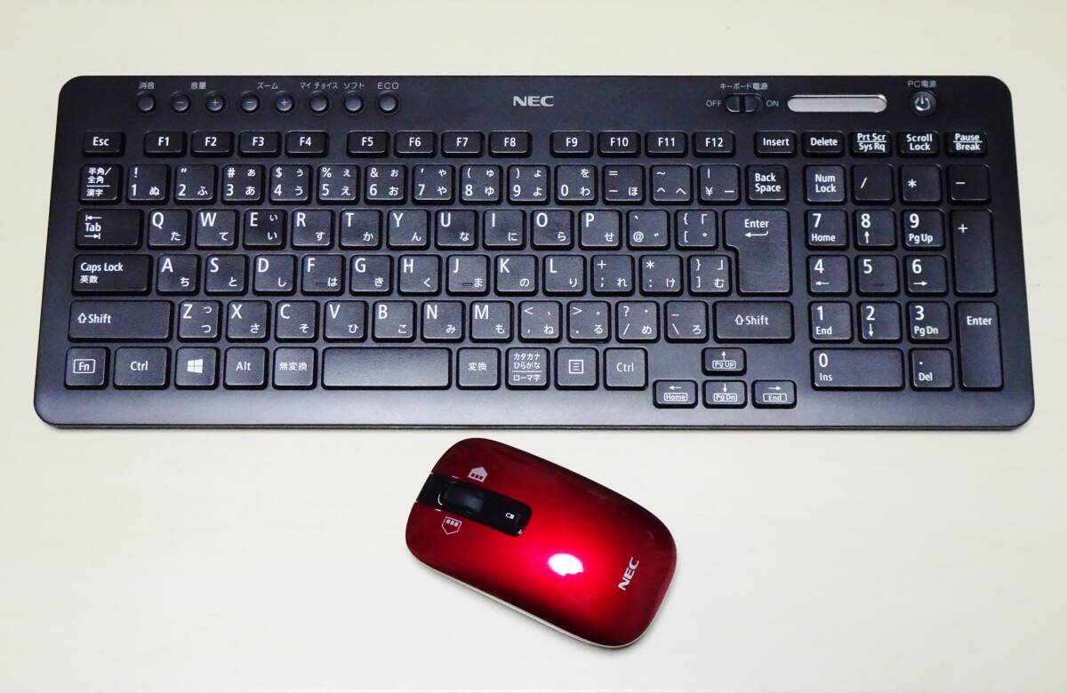 | NEC 純正 ワイヤレスキーボード KG-1129・ワイヤレスマウス MG-1132の出品です。 こちらの品は、当方自身が数年前に予備機用としてオークションにて購入した品となりますが、昨年パソコンを買い替えたこともあり、出品させていただきました。 中古品となりますが良好な状態の品となり、キーボードのボタンのテカリも殆ど無く、マウスの底面の擦れ傷等も少ない、使用感をあまり感じない綺麗な状態の品です。 ※綺麗な品ですが無傷ではございませんので、新品のような品をお探しの方はご入札をお控えください。 出品に際し、現在当方でしているNEC製パソコンにてペアリングして動作の確認を致しましたところ、マウス・キーボード共に何の問題無く良好に操作できる事を確認しております。 また、こちらのマウスおよびキーボードはNEC製デスクトップ型パソコンの一部の機種でのみ使用可能な品となりますが、当方では把握しきれておりませんので、必ずご自身でお調べくださいますようお願い致します。 過去に対応機種ではないにもかかわらず、見た目が同じなため、落札後に動かない等のクレームをされる方がおられましたので、必ず型番等のご確認をお願い致します。 尚、お届けした際には、パソコンと「connect」ボタンにてペアリングを行って頂きませんと使用する事ができませんのでお願い致します。 ※ペアリング方法は、パソコンによって多少の違いがございますので、ご自身にてお調べください。 到着後速やかに動作確認をして頂き、初期不良以外はノークレームにて宜しくお願い致します。 また、あくまでも中古品ですので極度に神経質な方のご入札はお控えください。 お支払方法はYahoo!かんたん決済にてお願い致します。 ※商品受け取り後、「受取連絡」をして頂きませんとYahooによる入金処理が開始されませんので、「受取連絡」だけは到着しましたら速やかに行って頂きますようお願い致します。 発送につきましては、おてがる配送ゆうパック(80サイズ)にて発送させて頂きますので、以下の料金をご負担くださいますようお願い致します。 | |