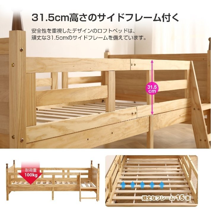 • 5.31.5cm高さのサイドフレーム付く】安全性を重視したデザインのロフトベッドは、頑丈な31.5cmのサイドフレームを備えています。美しいデザインとバランスを保ちながら、安心感を提供します。