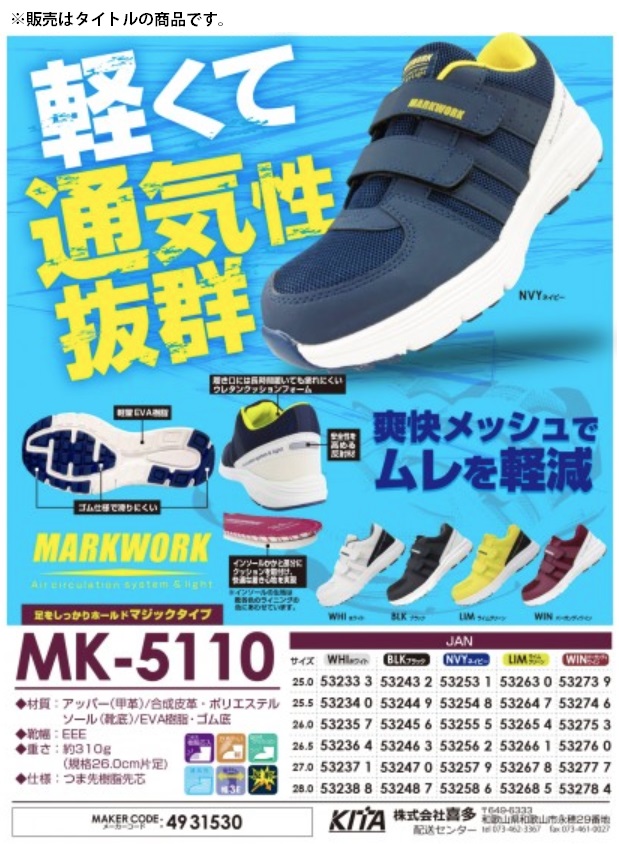 喜多 KITAMK5110 MARK WORK※販売はタイトルの商品です。脱ぎ履きしやすいマジックベルトタイプ!指先を守る軽量樹脂先芯(JIS規格S級相当)で軽くて疲れにくく、アッパー素材には目の細かなメッシュ生地を使うことにより空気の換気口をふやして通気性を向上させました。足を入れる履き口には、足首への負担をやわらげ、長時間履いていても疲れにくいウレタンクッションフォームを採用!靴底には、グリップ力に優れたゴムを配置し、厚めのミッドソールには、軽量化とクッション性を高める新素材EVA発泡ミッドソールで快適な履き心地と軽量化による疲労軽減を実現。かかと部には、視認性を向上させる反射素材を配置し、夜間作業の際の安全面にも考慮負担のかかる可動部の縫製は2重縫製で強度をアップ!かかと部の切り返しデザインがポイントです。■仕様通気:エアーサーキュレーションシステムメッシュ採用ソール:EVA発泡ミッドソール+ハイグリップラバー視認性:かかと部反射材配置■素材アッパー:合成皮革/ポリエステルソール:EVA樹脂/ゴムウィズ:EEEつま先:樹脂先芯