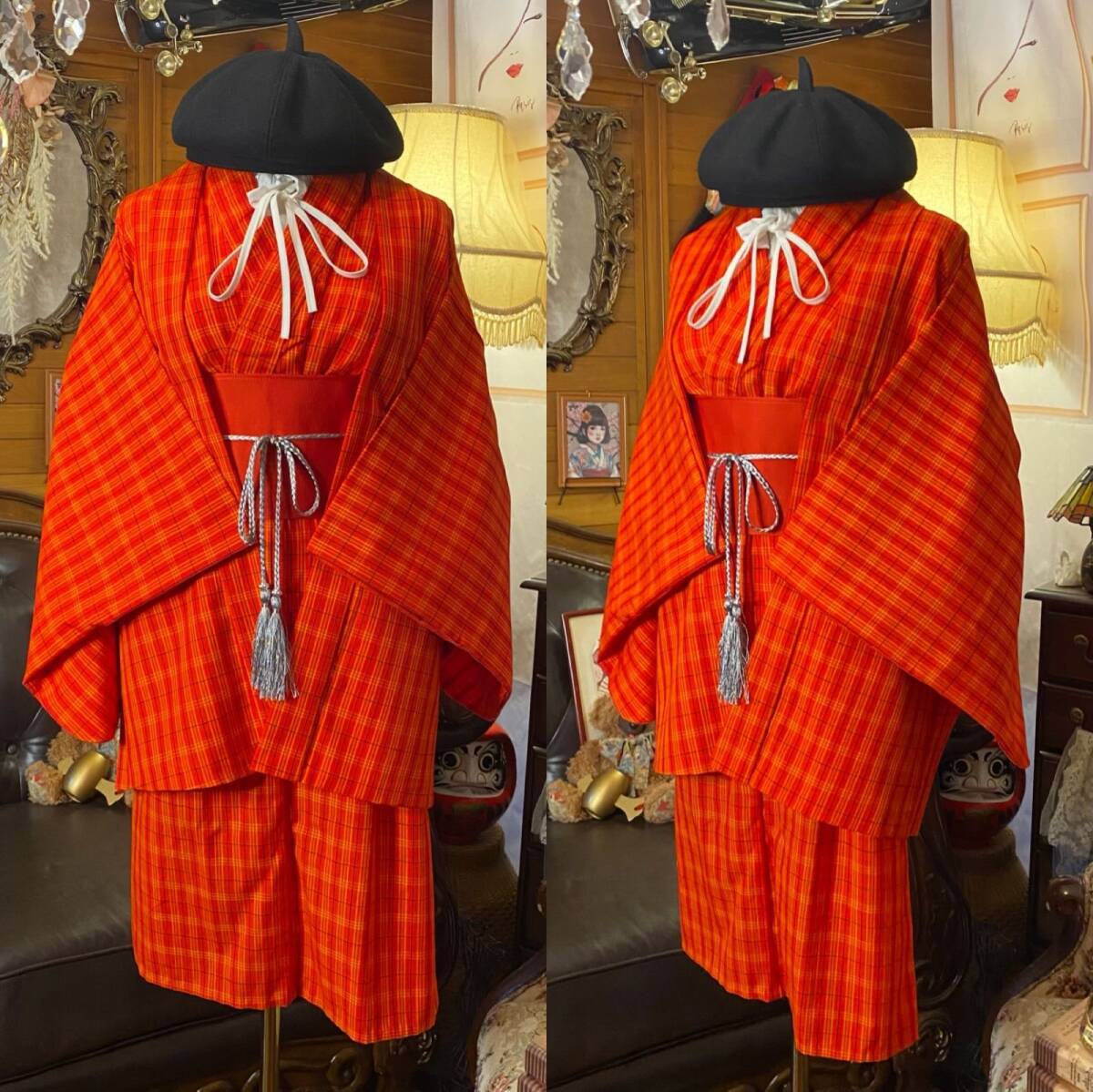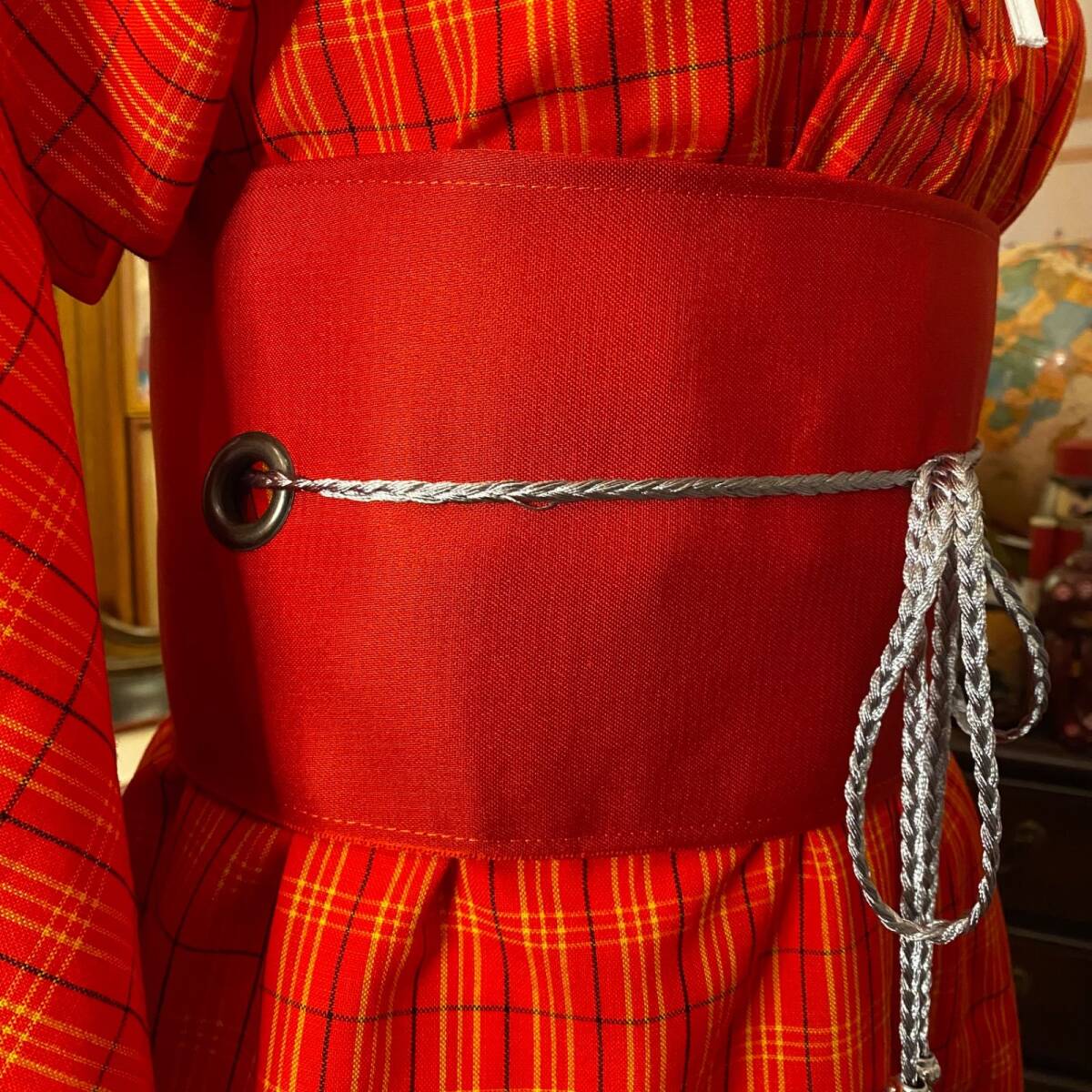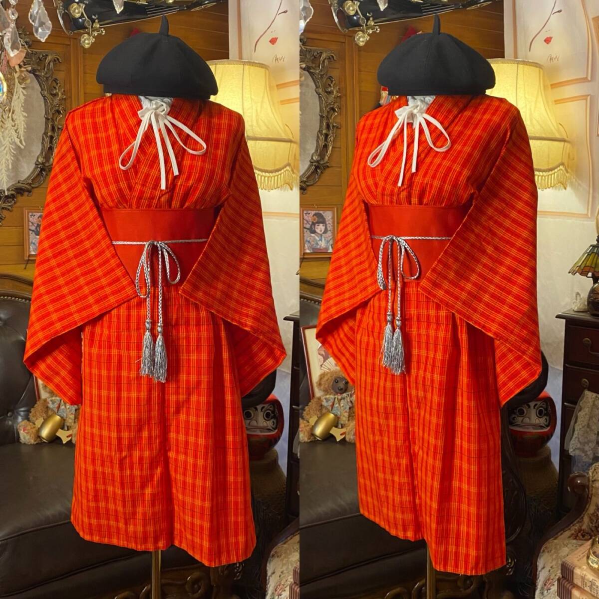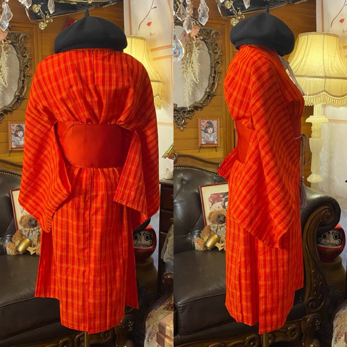 【 着物リメイクミニミディワンピース アンサンブル 帯サッシュベルト付き 和洋折衷 ハンドメイド レトロ 古着 鮮やかな柿色をベースに、黄・黒の細かな格子柄 aKW-104】