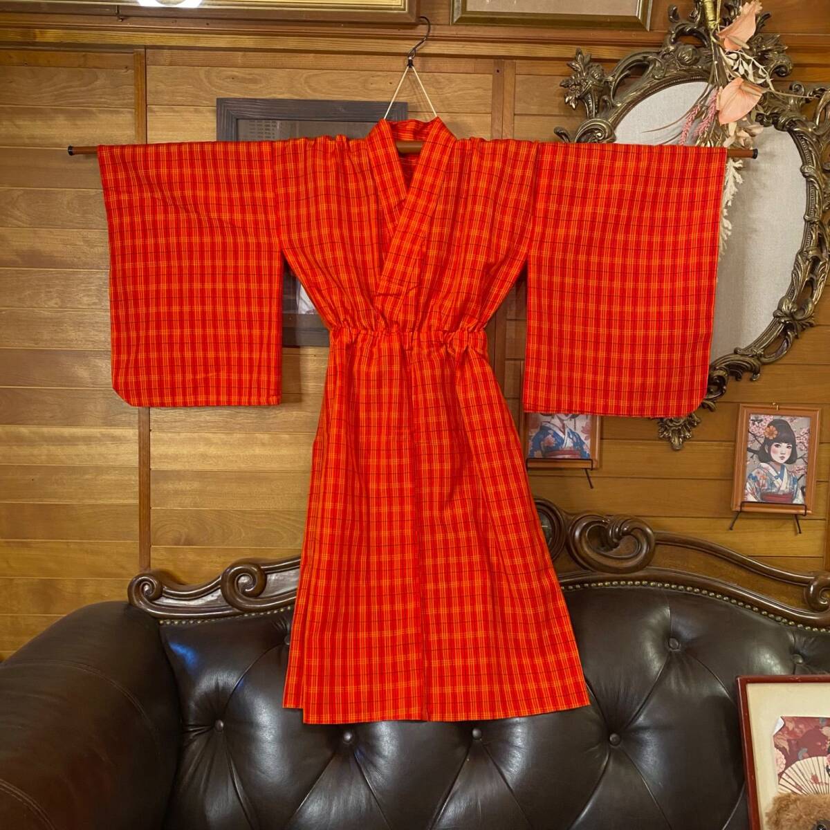 鮮やかな柿色をベースに、黄・黒の細かな格子柄が映えるアンサンブル着物から仕立てた、個性派リメイクワンピース。