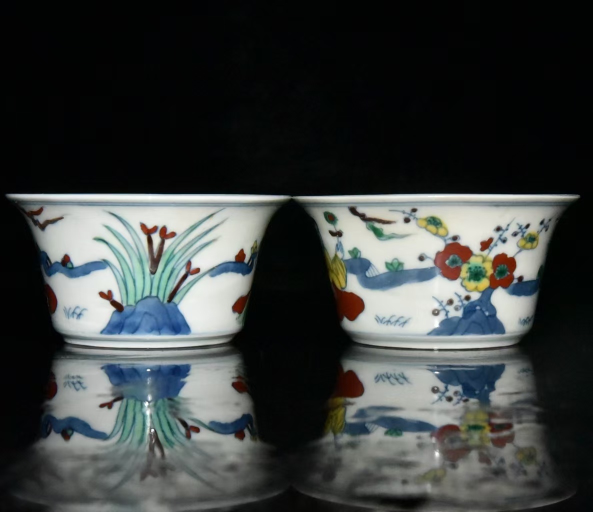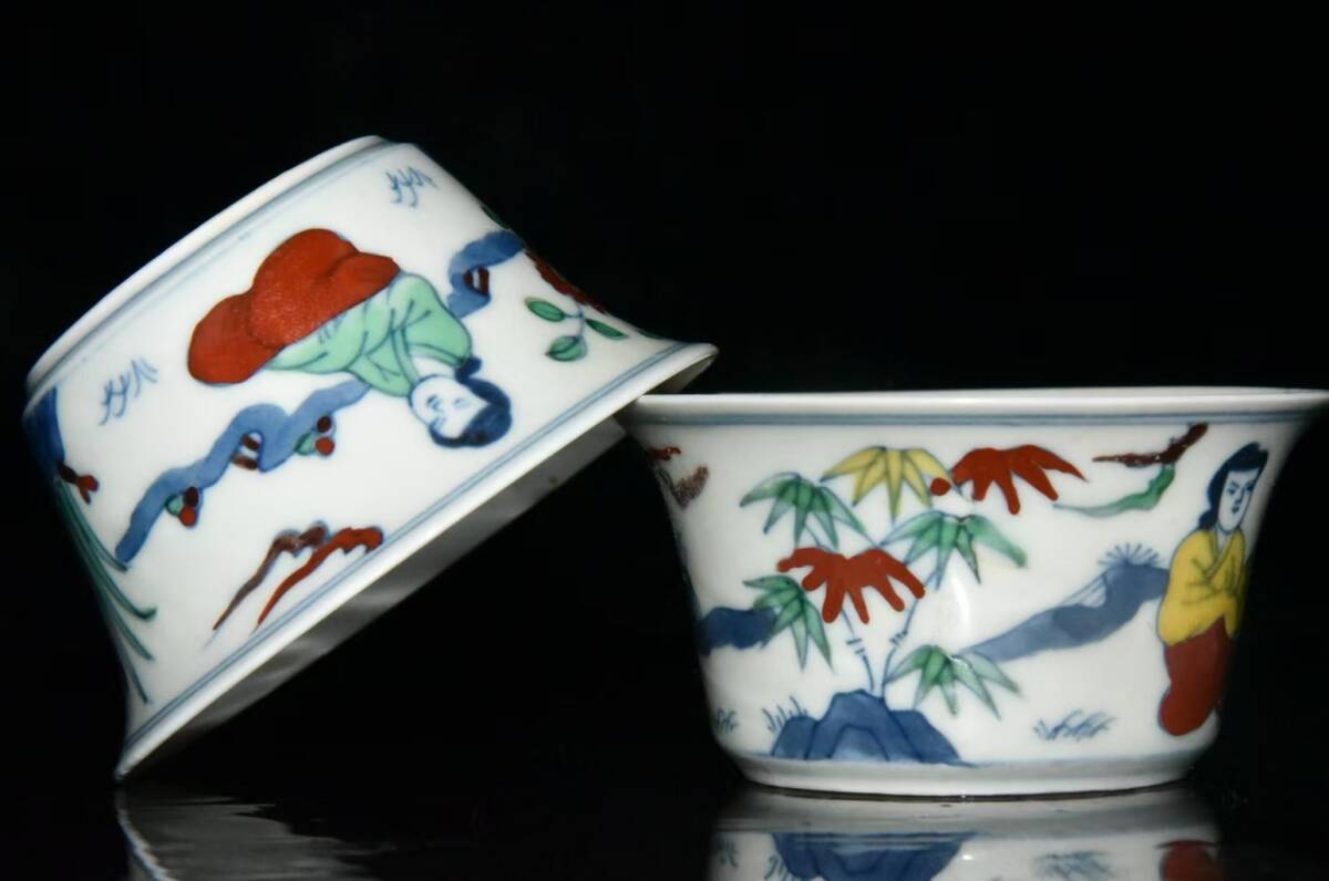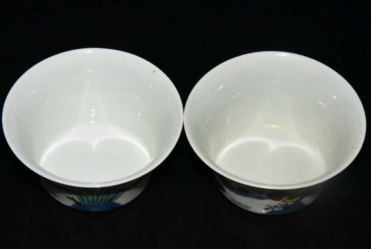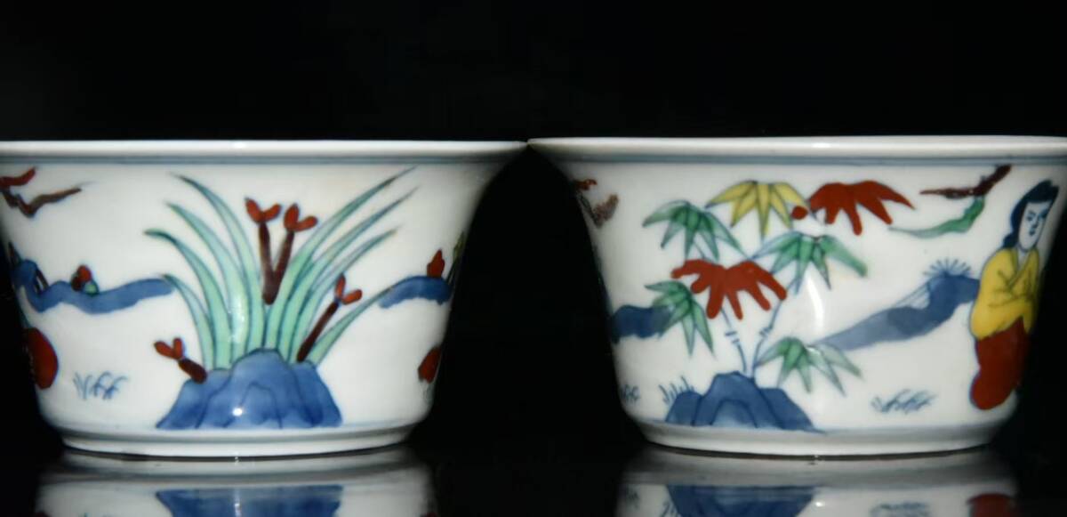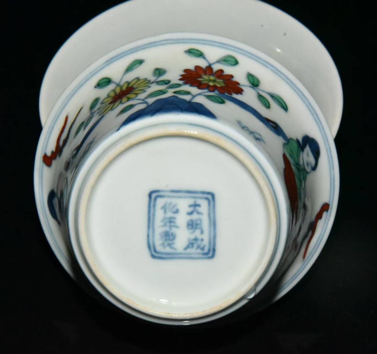 明時代 成化年制 官窯 闘彩 人物物語杯 茶盞 茶杯 杯子 茶道具 茶具 古陶磁器 唐物 古賞物 時代物 骨董品 旧家蔵出し 箱付 古美術品 古置物
