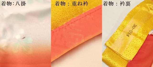 | 着物【化繊・重ね衿:取り外し可能】の 状態は接写画像のように八掛・重ね衿に薄い汚れがございますが その他表地は特に目立ったシミ汚れなどもなく大変良い状態です。 長襦袢【化繊】の状態は特に目立ったシミ汚れなどもなく大変良い状態です。 お安く出品致しますので、是非この機会にいかがでしょうか? ※表地衿裏に印字がございます。