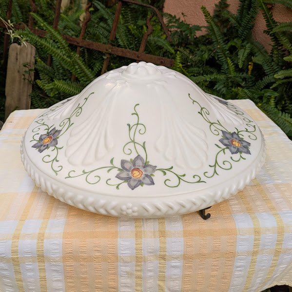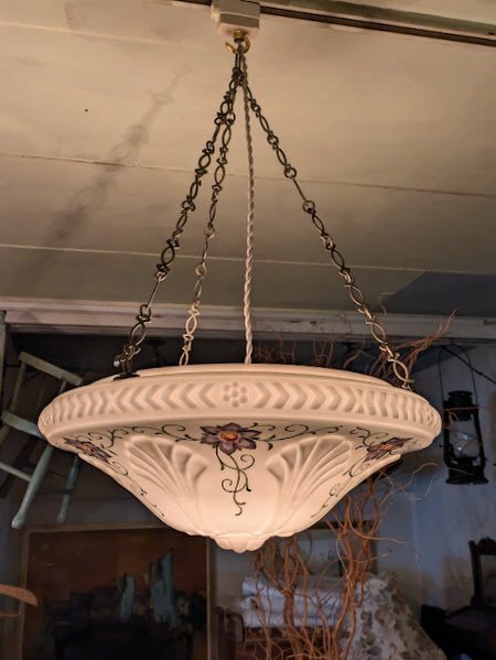 柔らかな乳白ガラスに、蔓草と花がハンドペイントで描かれたエレガントなハンギングボウル【45-267】