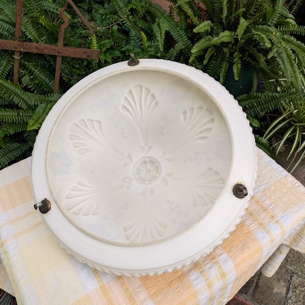 花のモチーフはクレマチスを思わせるデザインで、優美な曲線装飾がアールデコの雰囲気を漂わせます。当時の英国ではこのような自然主義的な植物モチーフが多く取り入れられていました。光源が直接目に入らない仕様なので、光を通すとガラス全体がふんわりと発光し、空間をやさしく照らします。ダイニングや玄関照明に取り入れると、英国アンティークらしい温もりのある雰囲気をお楽しみいただけますよ。