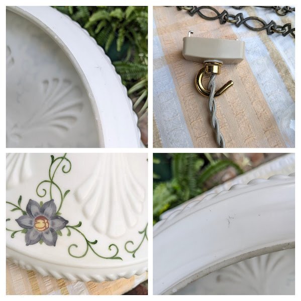 3本のチェーンで吊り下げるだけのシンプルな構造ですので、角型シーリングのフックにそのまま天井に吊り下げてください。大きなダメージはありませんが、長きに渡り使われてきた証として小さな傷や落ちきれない汚れを含みます。福岡市南区の店舗にてお渡しもできますのでお気軽にどうぞ!