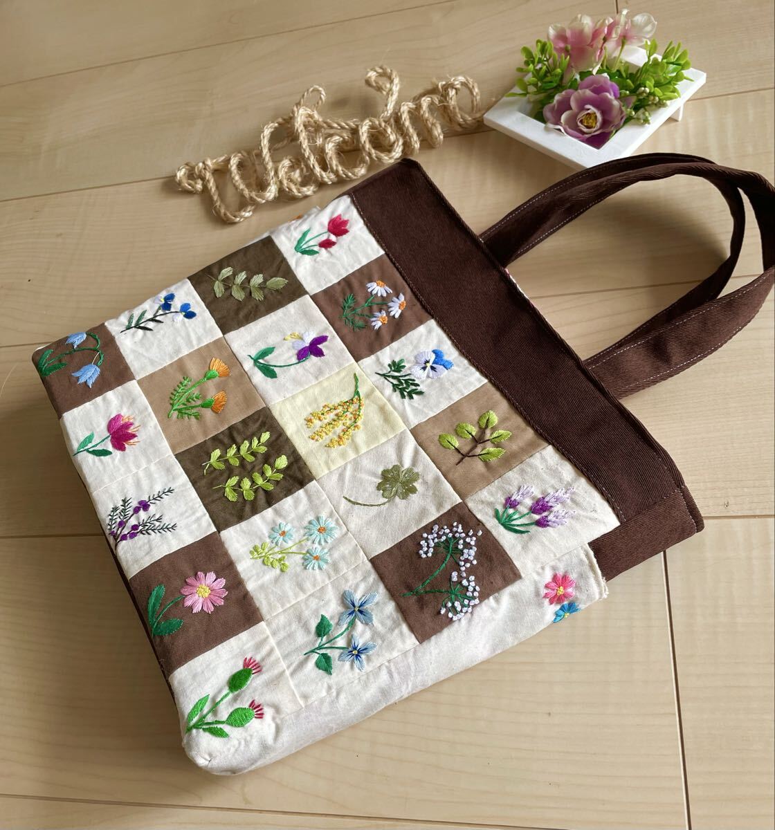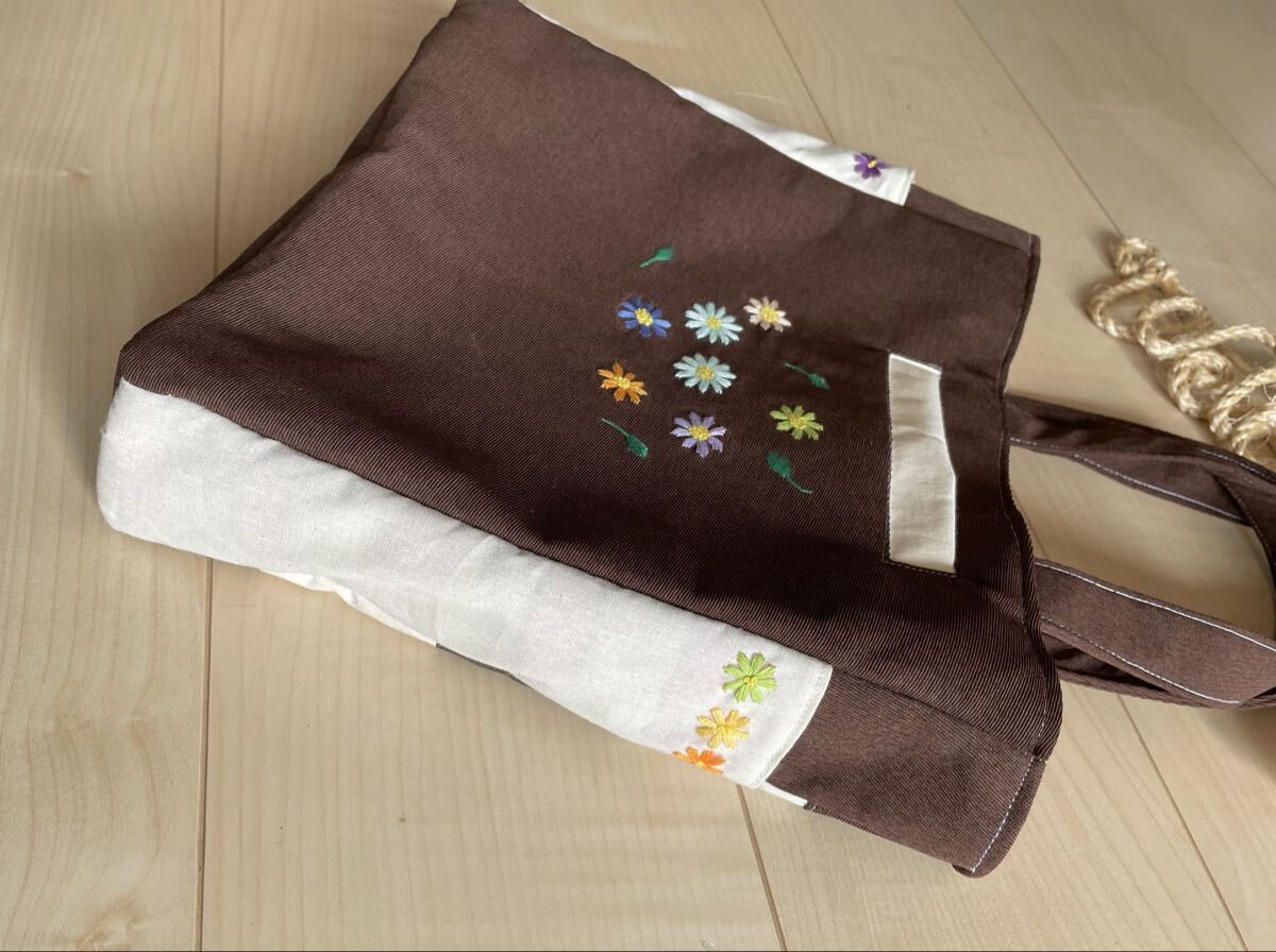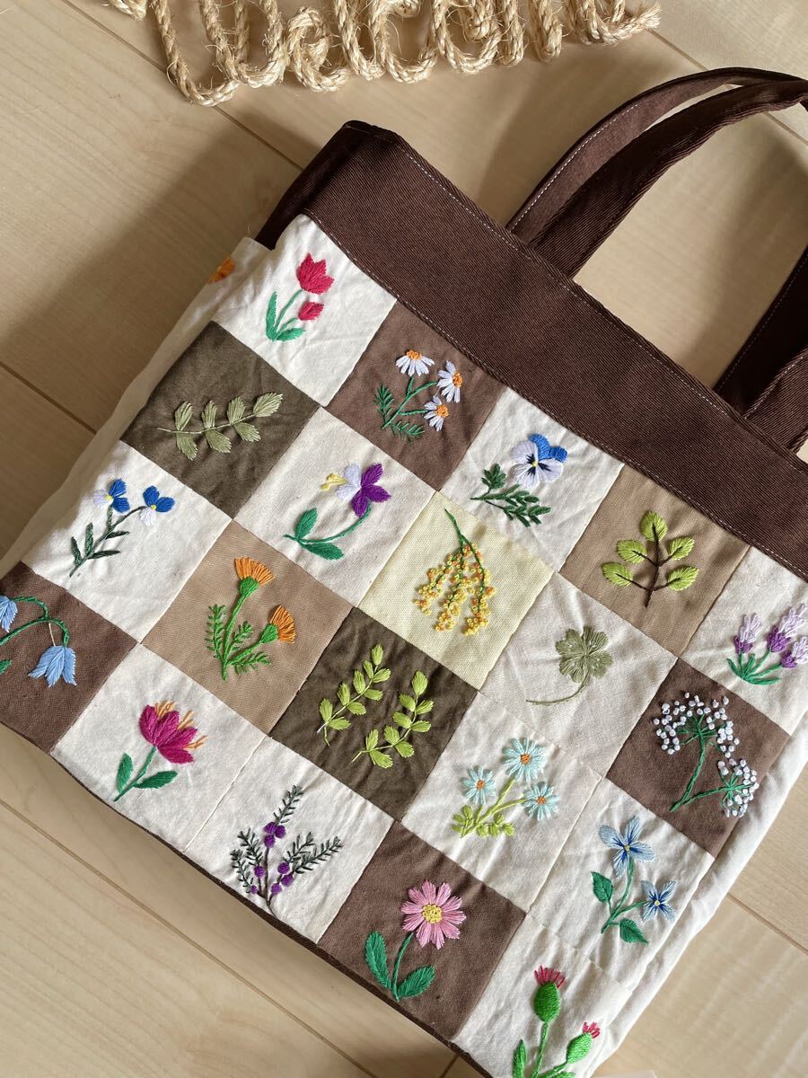 パッチワークで繋いだ生地にお花を刺繍をしました。