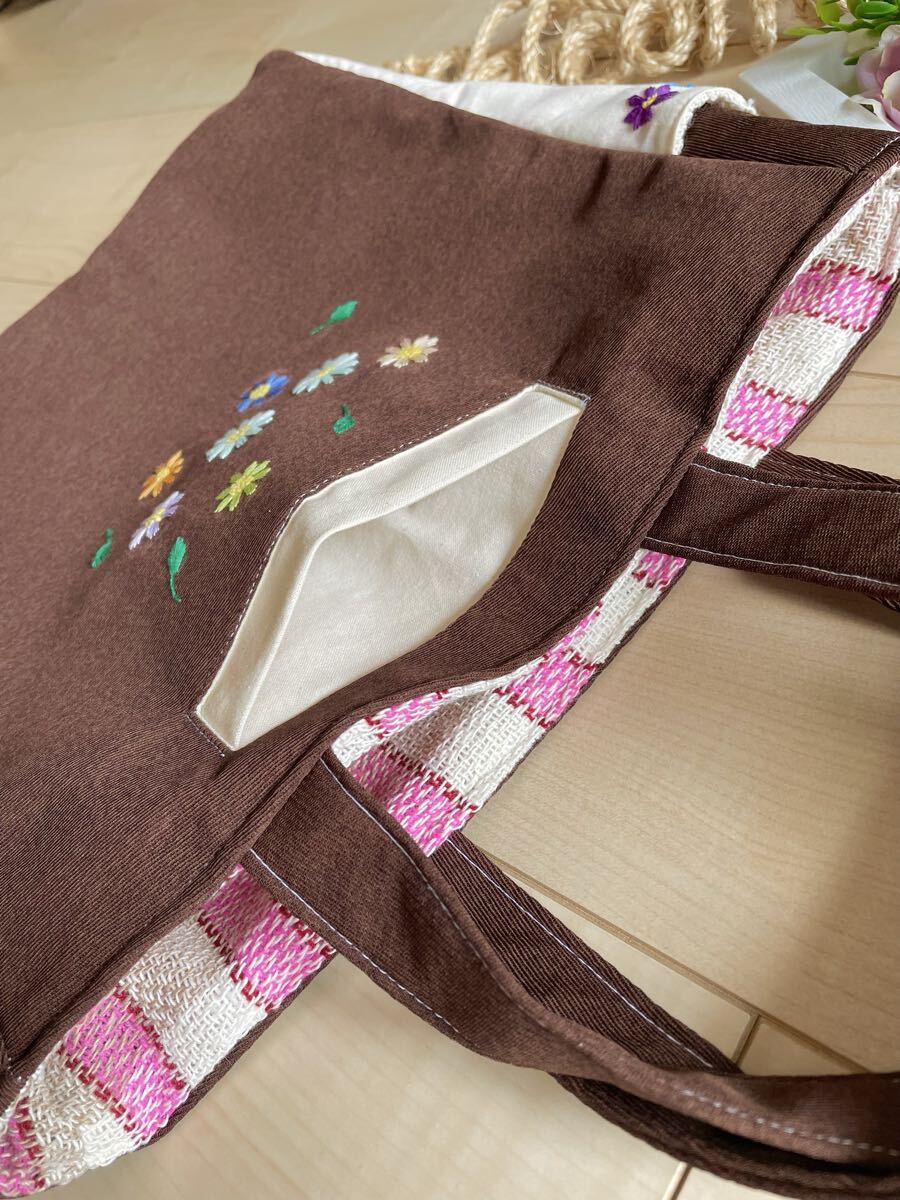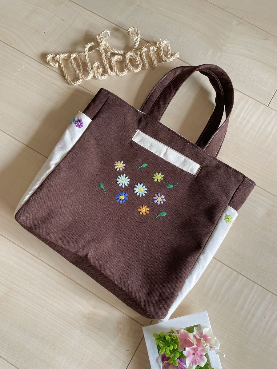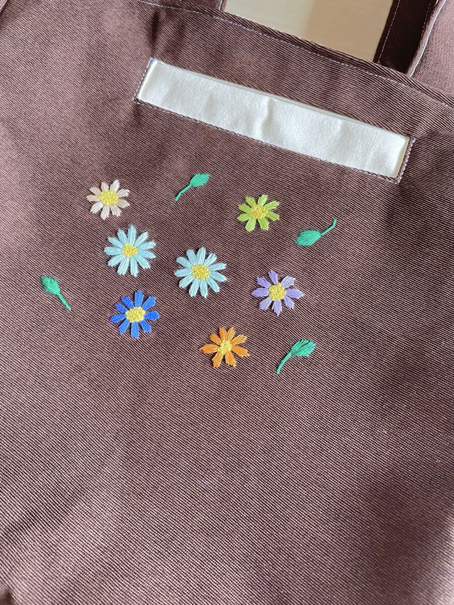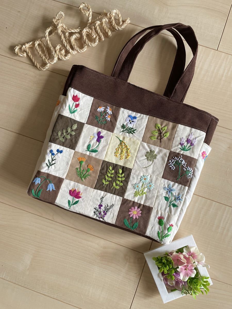 パッチワークで繋いだ生地にお花を刺繍をしました。