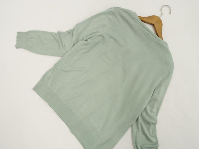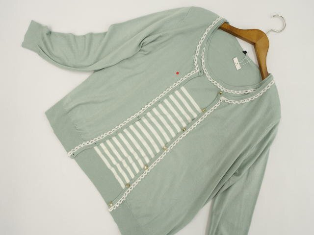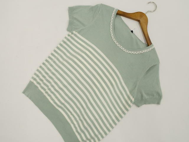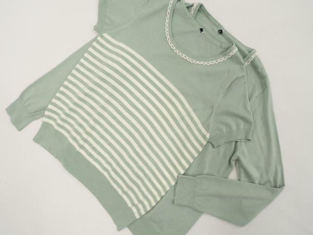洗える長袖カーディガン+半袖カットソー ニットアンサンブル2点セット 3L グリーン系/グリーン系&グリーン系×オフホワイト ボーダー柄