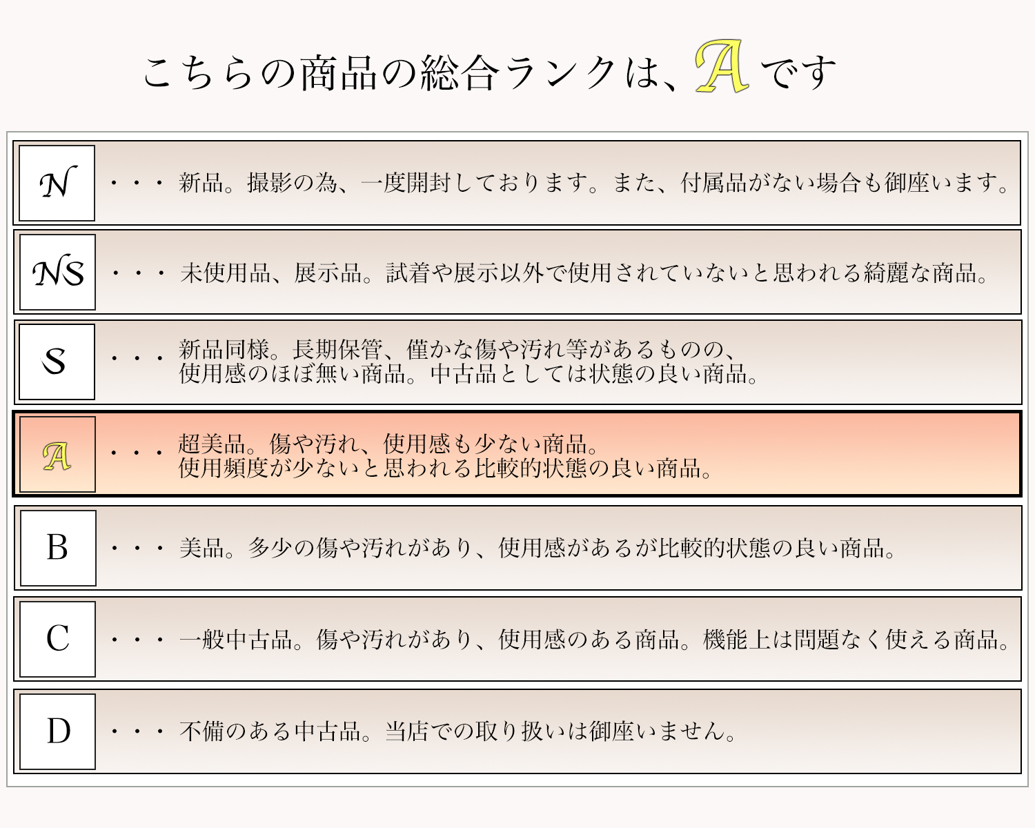 | 近年、WEB上でブランド商品の売買が多数行われておりますが、商品状態や金具の傷を分からない様にされているものも多く見受けられます。届いた商品を見て、 『こんなに金具に傷があったなんて…』 『見ていた商品写真とかなり違う…』 そう感じた事は御座いませんか? 匿名配送のシステムを利用し、一般ユーザー様を騙すようなケースが見受けられ、ネットだからと泣き寝入りしている方がいらっしゃるのも事実です。当店はお客様に満足して使用して頂く事を考えて品物を選定しておりますので、ご安心ください。お客様に、技術の粋をお届けします。 また、業者専門の大手古物市場で買い付けた商品を取り扱っているため、全て真贋確認済みの商品となります。 合わせて当店独自ルートでの鑑定も行っておりますのでご安心してお買い求めください。 ※仕入は大手古物市場、大手販売店のみで、一般ユーザー様からの直接買取は行っておりません。 商品状態について、本文・注意事項を最後までよくご覧の上ご入札ください。 皆様の参加を心よりお待ちしております。 |